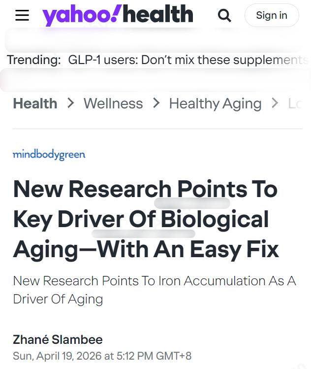 铁元素会随着年龄增长悄悄在器官内积累,这个过程被科学家命名为"铁老化",正在被认为是生物衰老的重要驱动机制之一。