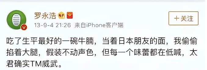 他曾在社交平台炫耀,自己在日本吃了一碗牛腩,味道合心意,居然当着日本朋友的面,偷偷掐着大腿在心里喊“太君确实tm威武”。