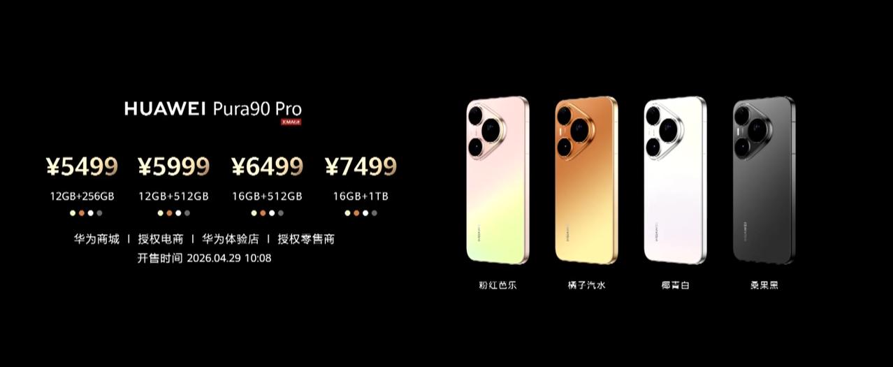 Pura90 Pro 12GB+256GB 5499,12GB+512GB 5999,16GB+512GB 6499,16GB+1TB 7499。