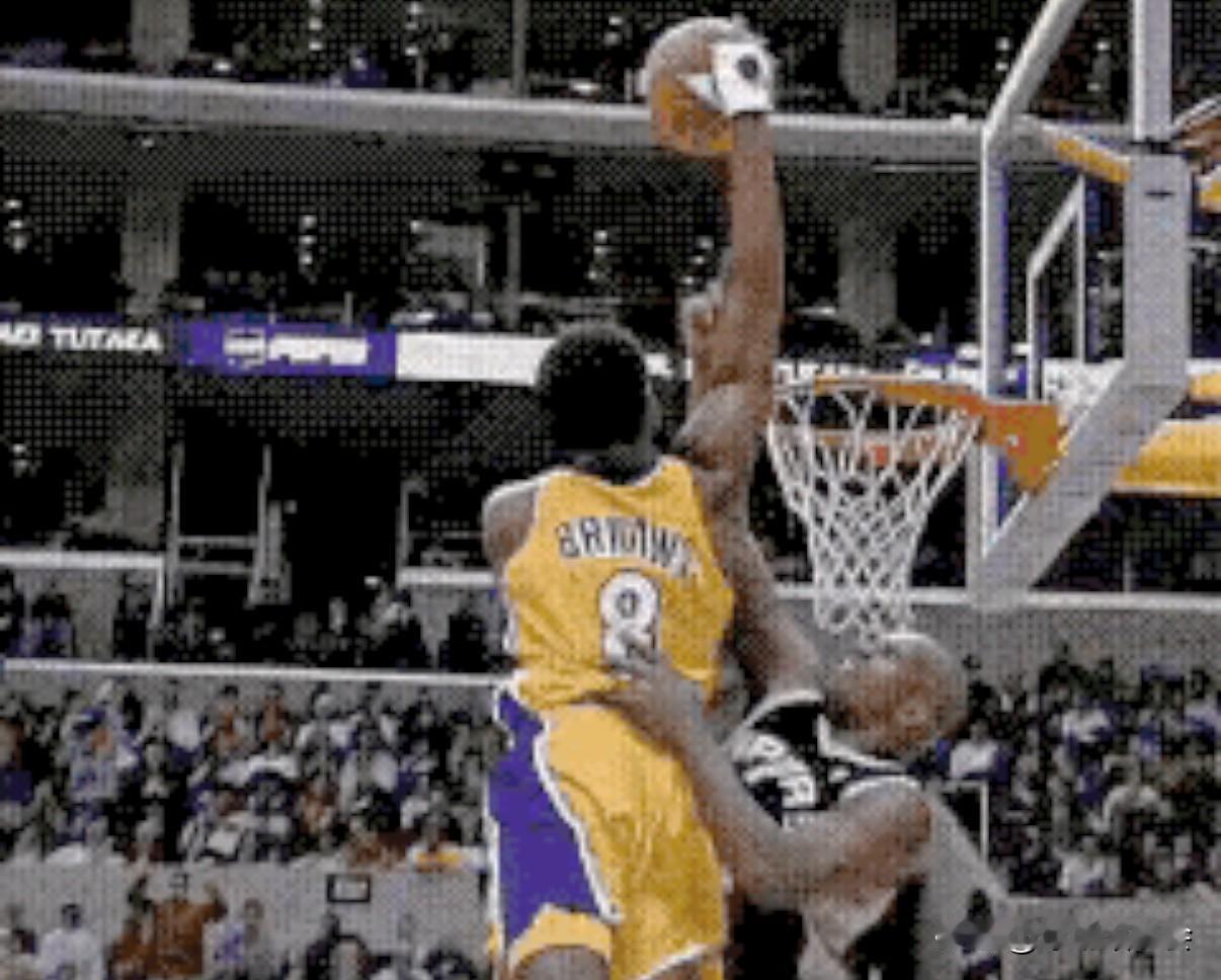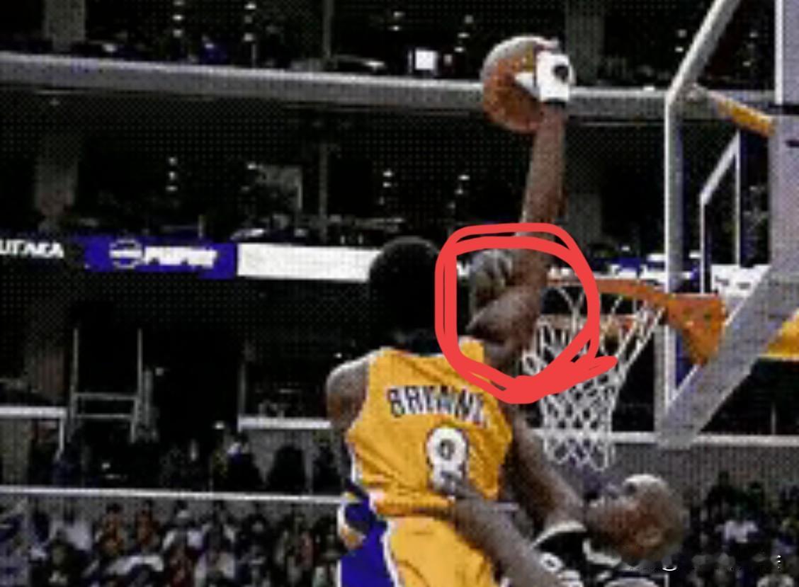 在多种阻碍之下,科比当时弹跳到最高点时,肩膀都快接近篮筐的高度了……