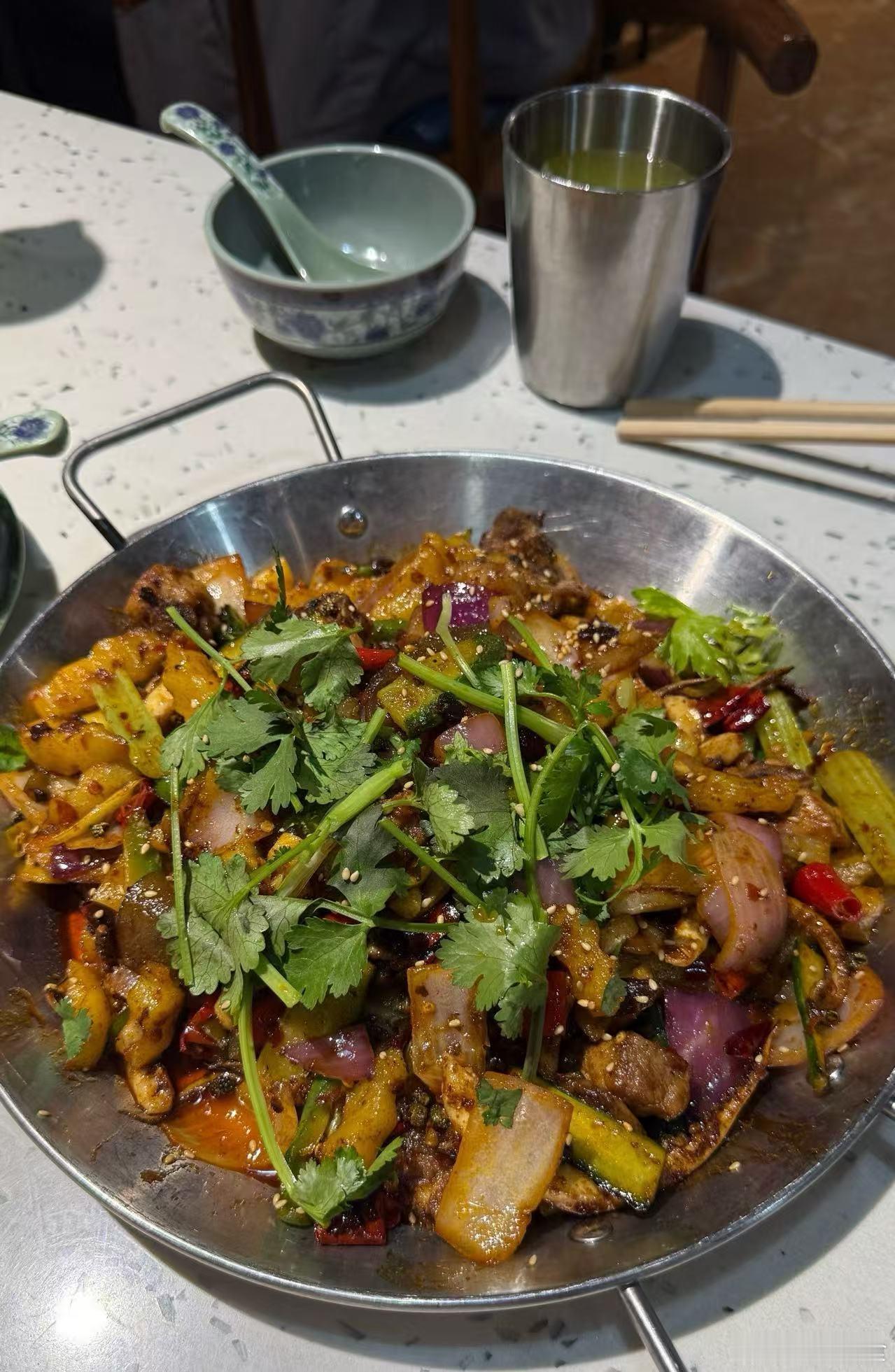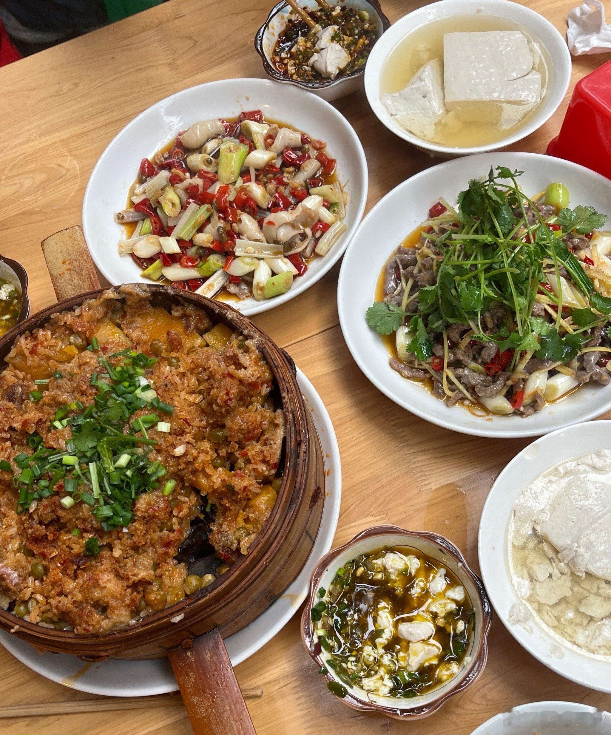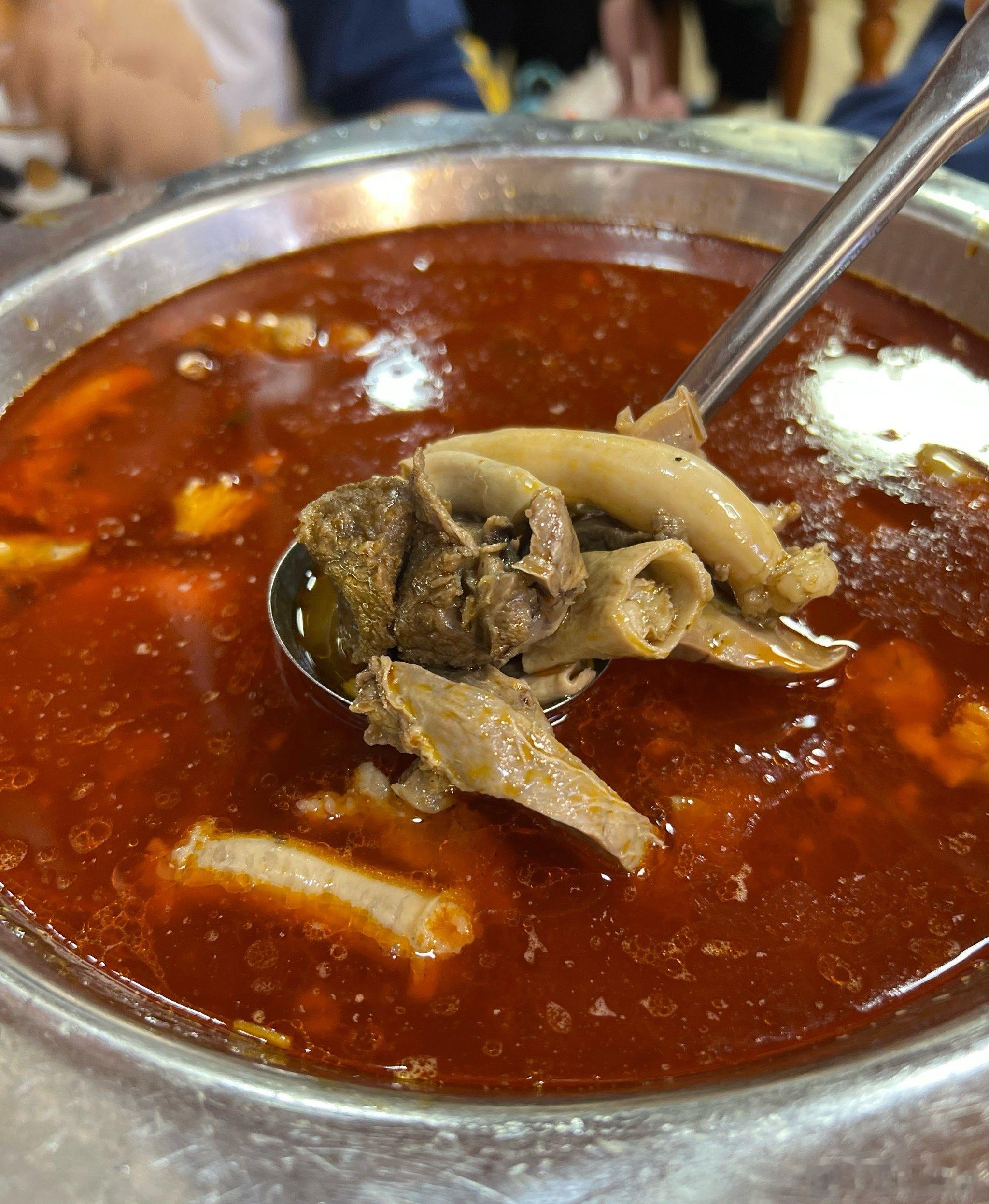 何三红汤羊肉:羊肉很新鲜,没有经过冰箱,香味浓郁,红汤就是豆瓣加香料炒制而成,并不辣,咸香口,汤也可以喝,用的山羊肉,有一点膻味,粉蒸羊肉其实是羊排,分量不小,调味合适。