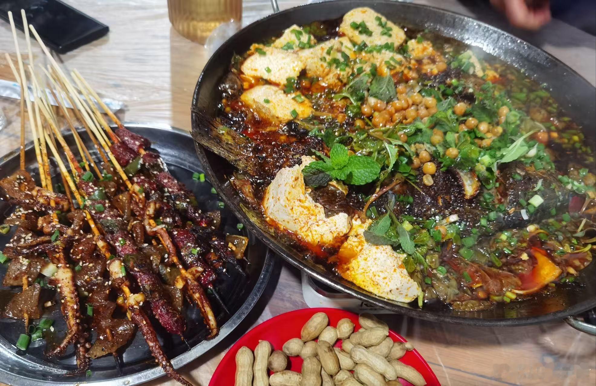 赵家铺烧烤(合江店):店面很大,环境还可以,整体味道算不错,招牌烤串和黑胡椒烤串挺好吃,外焦里嫩带着炭火气,包浆豆腐也很不错,烤鱼鲜辣入味,鱼肉很嫩,木姜子味独特又上头。