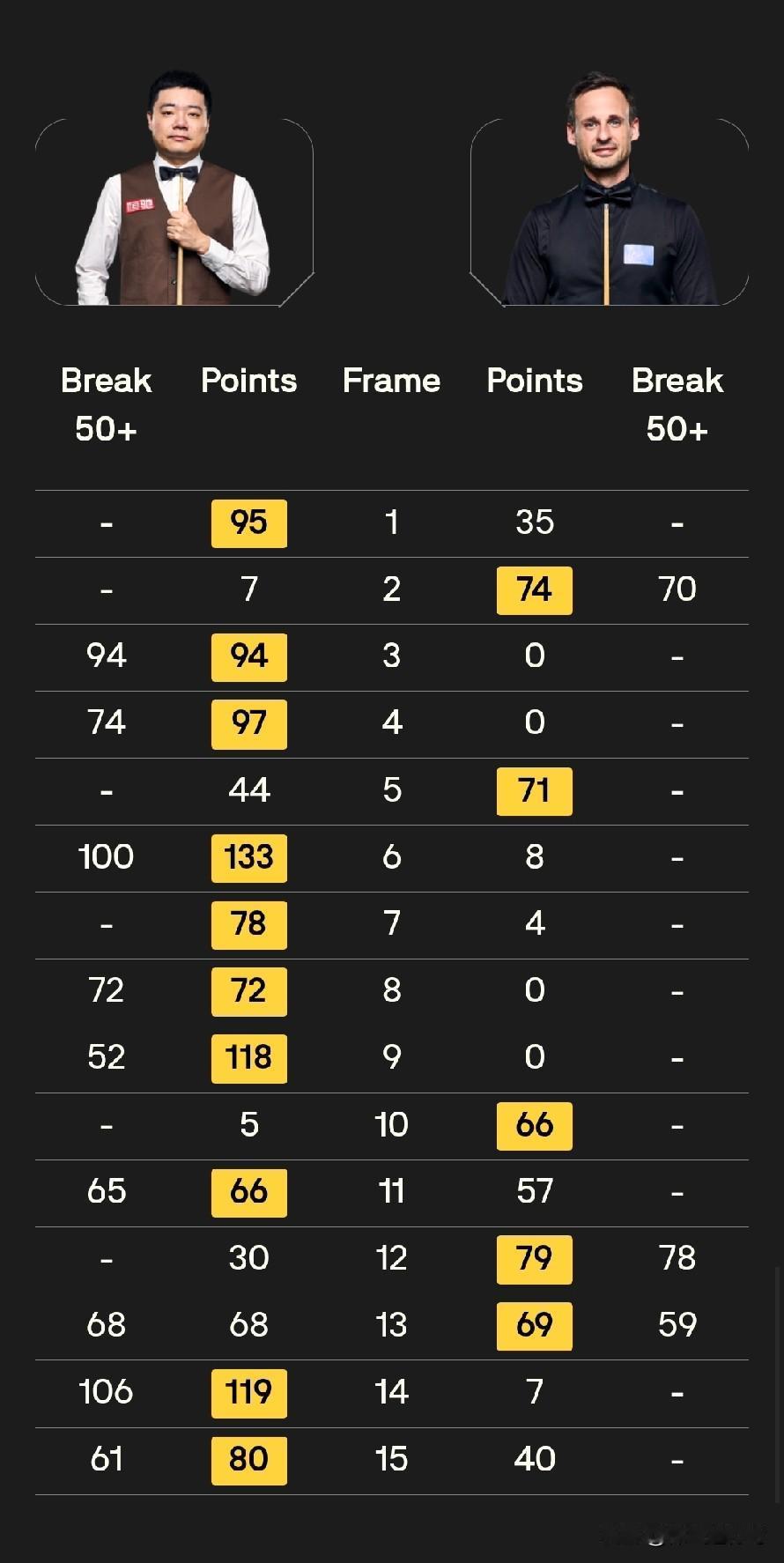 首阶段7:2大比分领先的丁俊晖,在今天的第二阶段开局并不顺利。中场休息之前他只拿下一局,被吉尔伯特将比分追到5:8。但中场休息回来后丁俊晖逐渐找回状态,轰出两连鞭后,10:5击败吉尔伯特,顺利晋级。