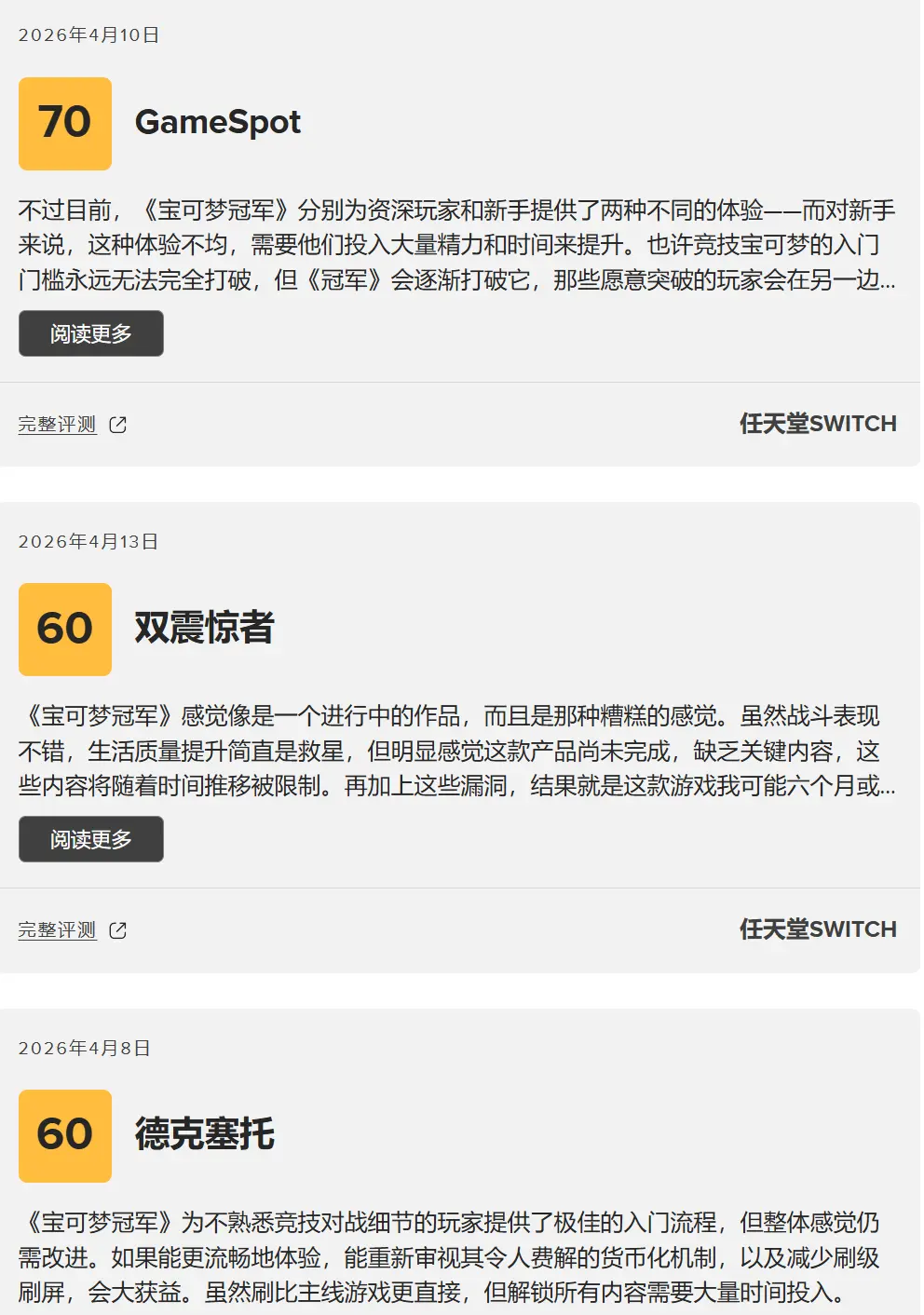 2026年宝可梦游戏评分。宝可梦官方指定的VGC对战平台游戏,在Met...