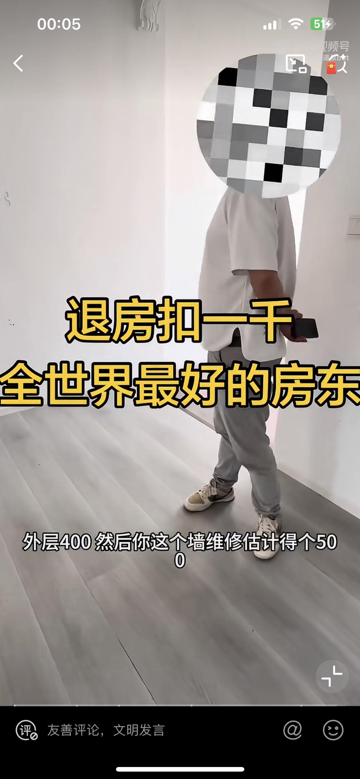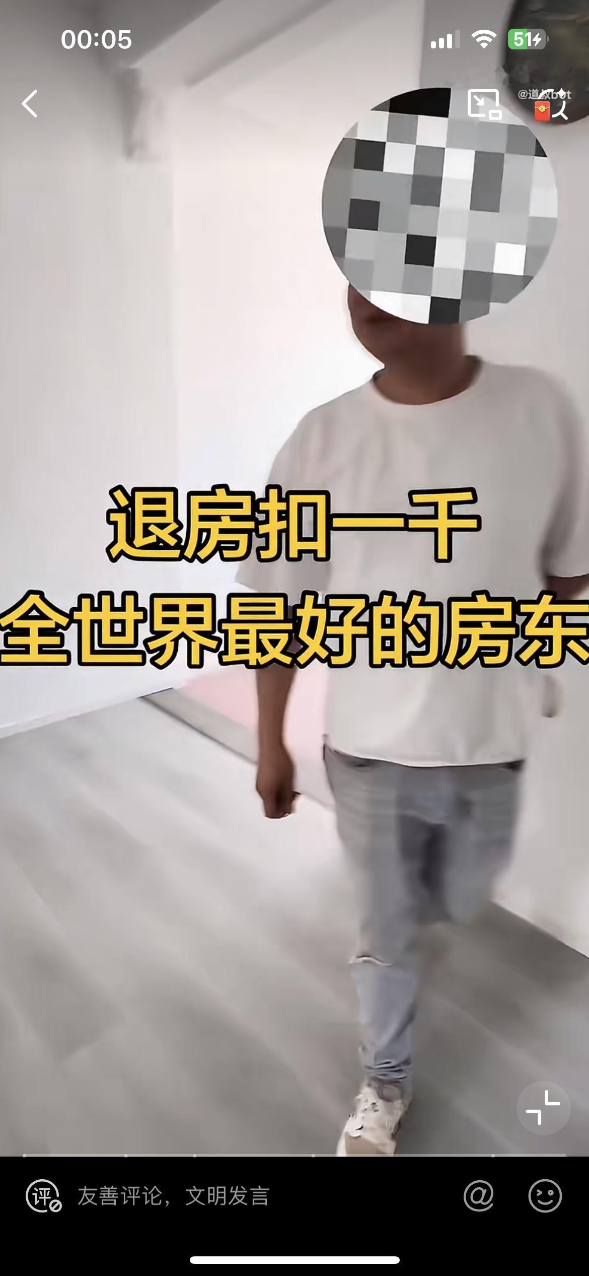 来见识一个垃圾房东,无缘无故找茬就扣了租客 1000 块。这是一个两室一厅的房子,租客要退租,房子收拾得干干净净,是一个非常讲究的租客。可是房东来了却开始提灯定损,指着床头柜说损坏了要扣 100,指着厨房里面墙上的一些斑点,搞清洁要 400。空调外机有灰尘没擦,搞卫生要钱,这那的又指了一堆。租客最后问他要多少钱,他说扣 1000 块,从押金里面拿。租客太无语了,自己住在这个房子里面小心又小心,临走之前还仔细打扫过一遍,基本上和租他的房子的时候没什么二样,没想到还是被这名房东借故找茬要扣钱,大家记住这个房东,避雷避坑。