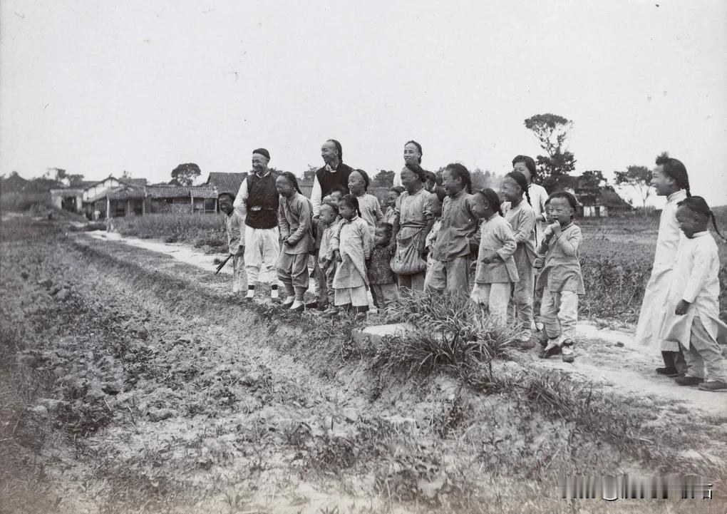 脚下是翻耕过的农田、乡间田埂土路,远处散落着连片的农家坡顶瓦房,四野皆是开阔乡野田地,草木乡间,没有朝堂风云、没有战乱流离,没有刻意摆拍的拘谨,只是乡间农人偶遇镜头,纯粹质朴的欢喜瞬间,在绝大多数满是苦难悲凉的晚清老照片里,这帧温暖烟火气格外难得