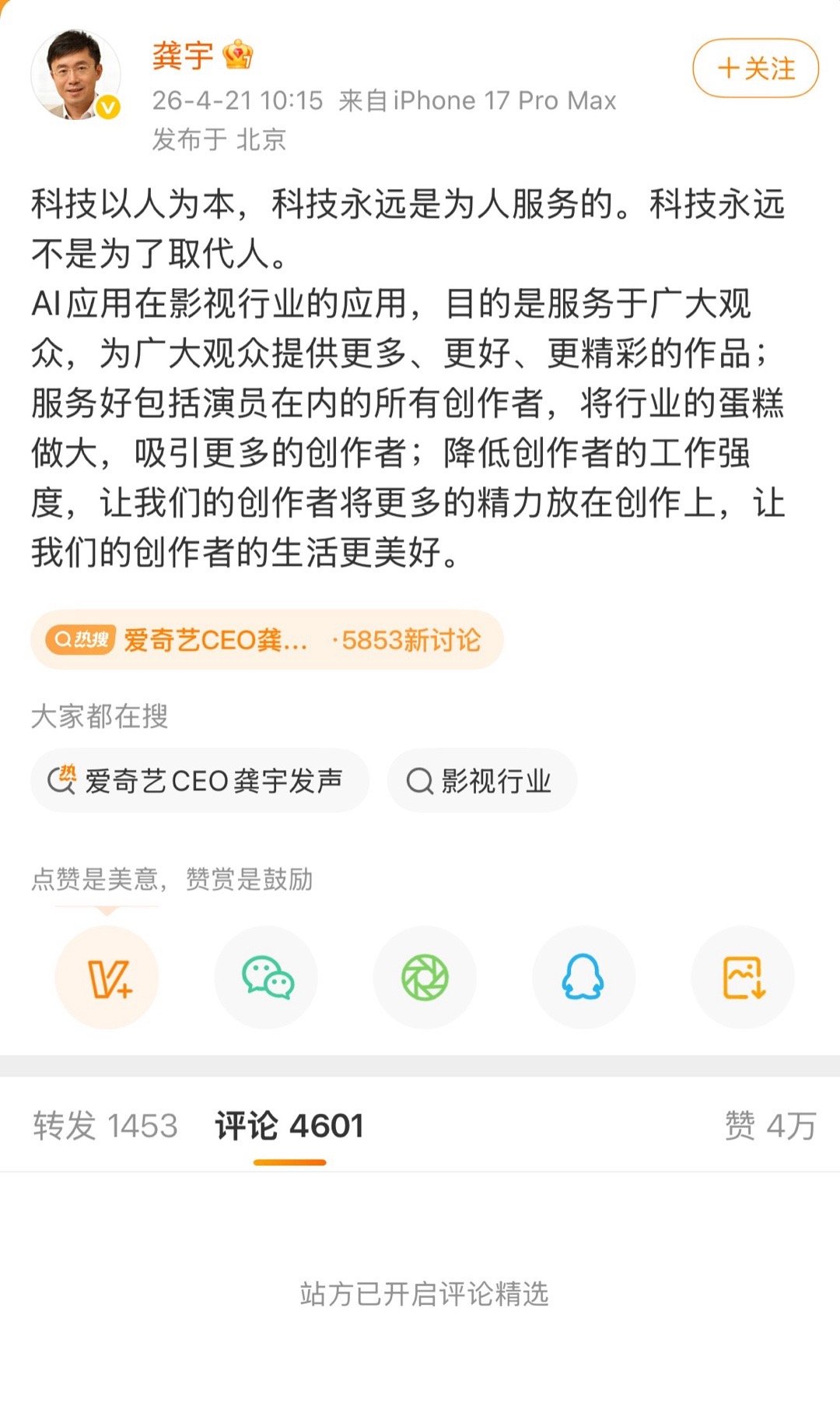 除了中国游泳队那个账号以外我第一次看到了站方隐藏转发+pl精选。也是跟崔国一样搞起tq来了爱奇艺CEO龚宇发声