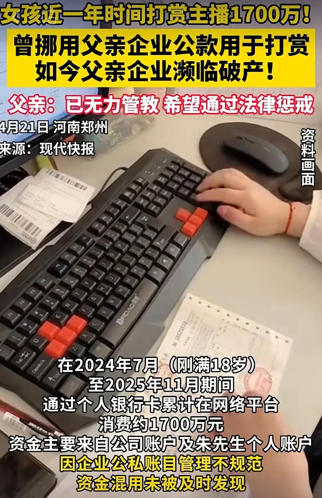 这个中专辍学的18岁女孩,被父亲安排在自家公司里当出纳,可以随意操控公司财务。这个对钱压根没有认知的女孩,在一年多的时间里,几万十几万的挪用公司资金,打赏给了素不相识的网络主播,似乎自己扔出去的就是粪土,亲爹上千万的公司资金就这样化为乌有,另外还有几百万拿来挥霍买盲盒。其实也怪这个女孩父亲太心大,早在女孩一开始做出纳的时候,就发现公司账户突然出现五六十万的资金缺口,一问知道是女孩拿去打赏了。显然这个父亲没当回事,才有了女孩之后变本加厉的肆意挥霍,最终酿下大错,令这个父亲的公司资金断裂濒临破产,全家人都得跟着买单受罪。
