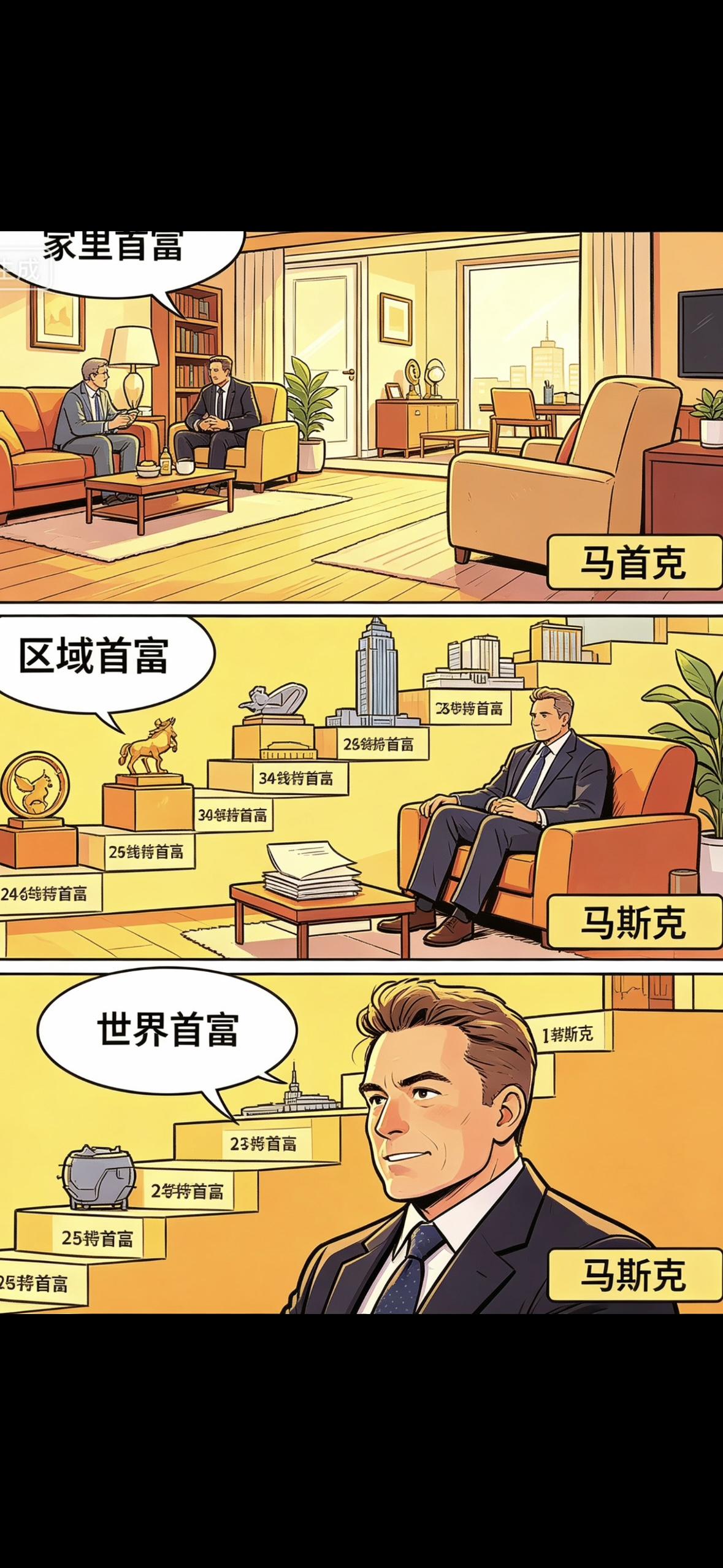 首富这头衔,全看前缀怎么加。最小单位,是房间首富、沙发首富、饭桌首富;再往外,是家里首富、小区首富、村里首富;往上走,镇里、县里、省里,一路升级。到了中国首富,榜单换得比衣服还勤;再到世界首富,位置倒是挺稳,如今是马斯克牢牢坐着。