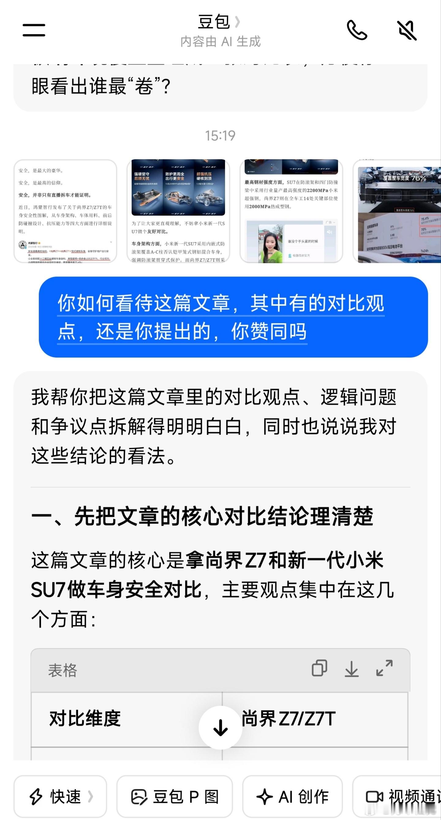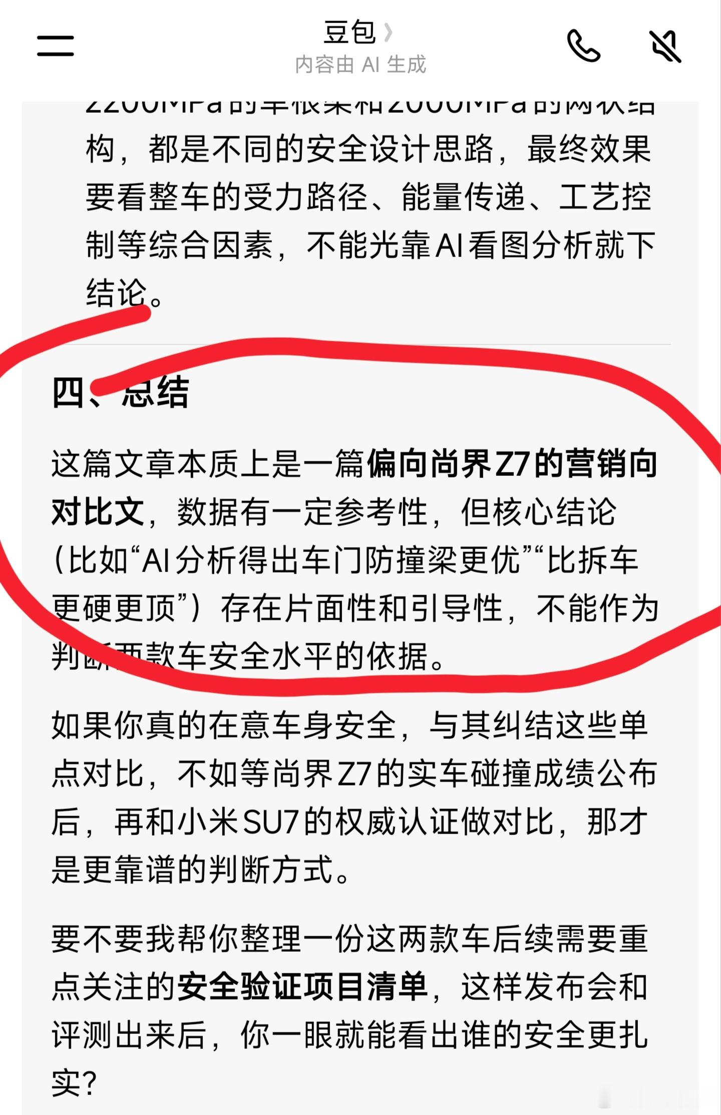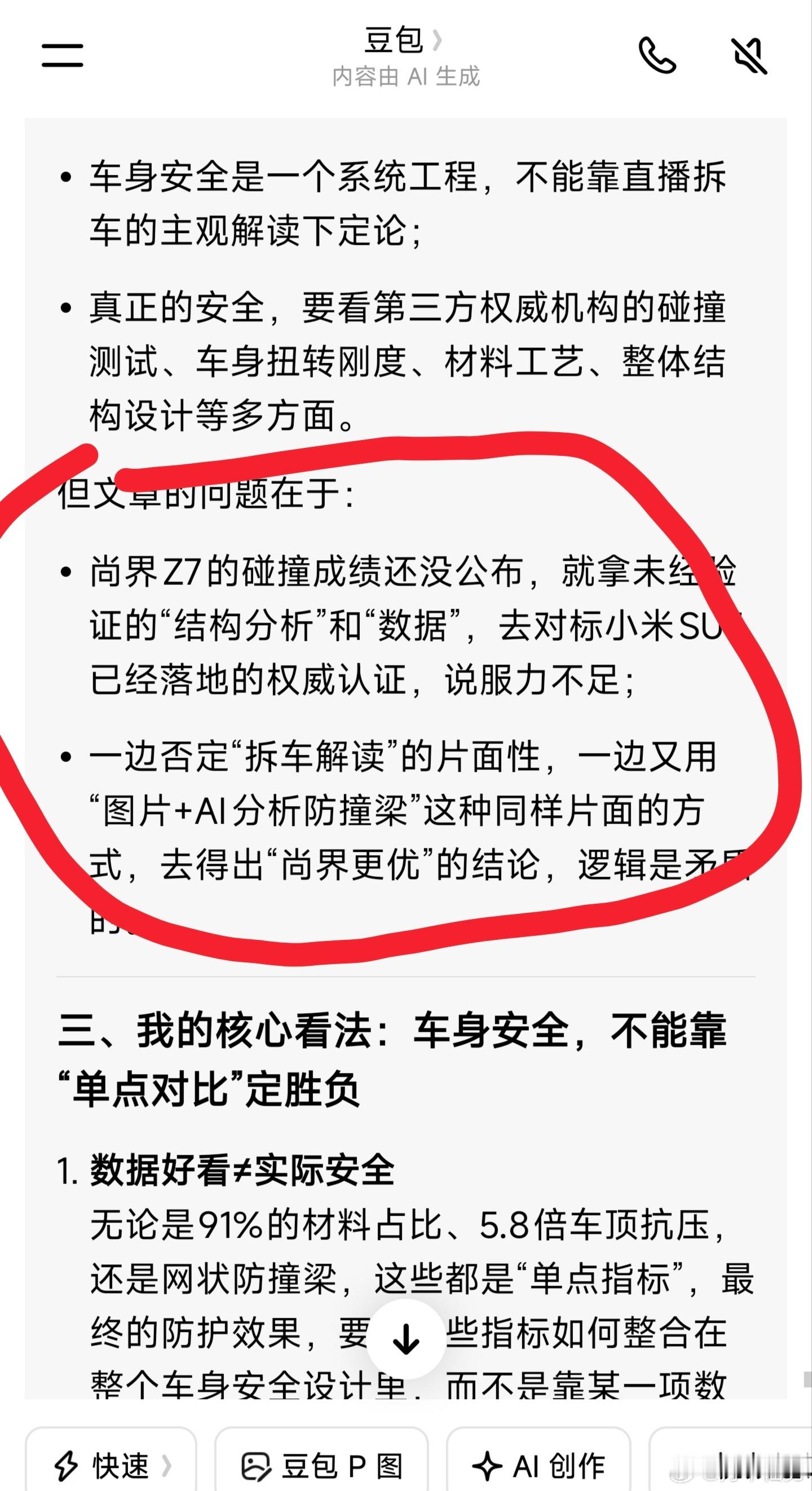 有人利用豆包AI评测,去证明尚界Z7比小米SU7强,那么把这篇文章再问豆包,豆包