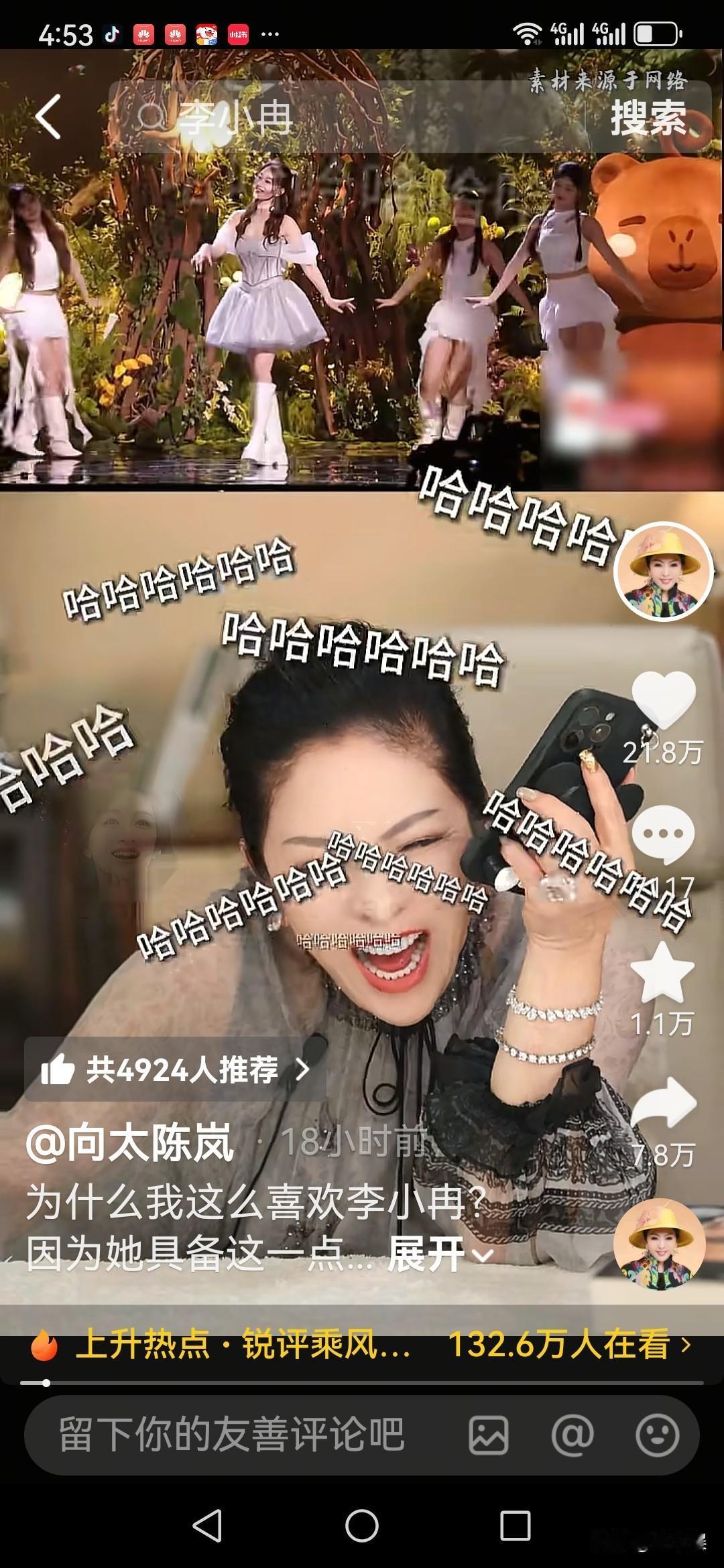 近日,李小冉参加综艺《浪姐》因唱歌走音上热搜后,向太陈岚在视频中公开了她与李小冉的通话,李小冉的一句话,惹得向太哈哈哈大笑起来。