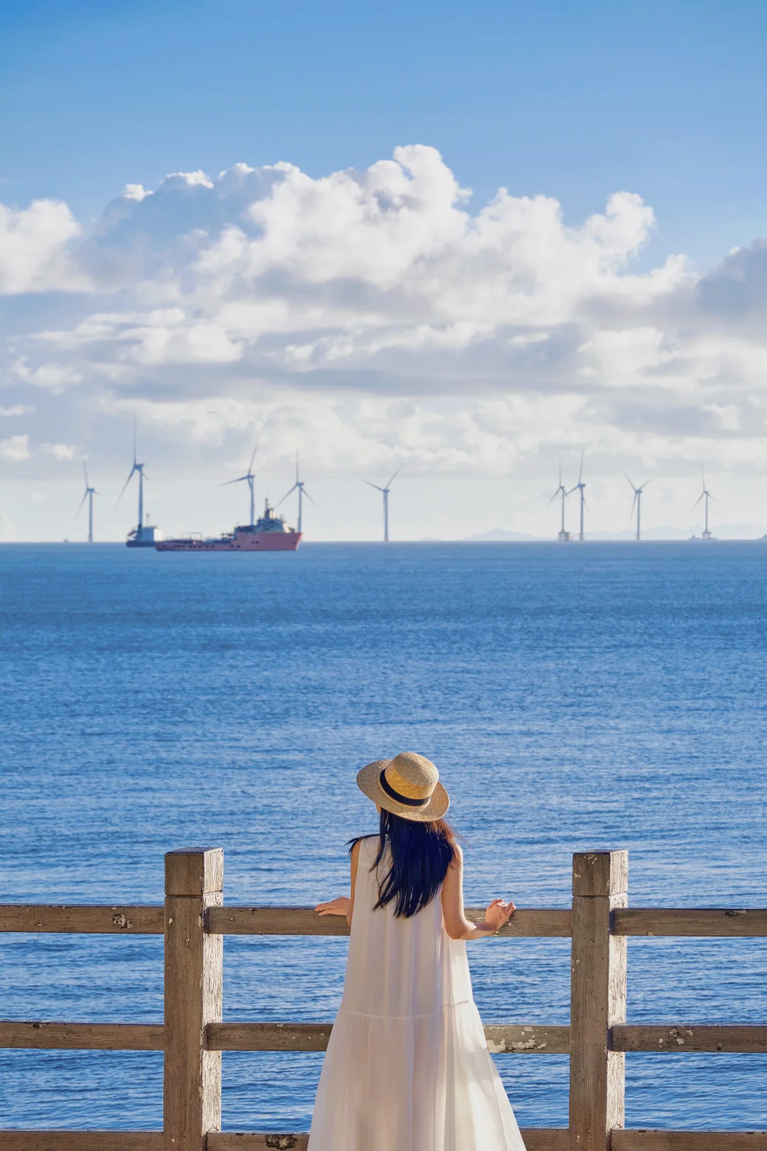 灯塔守着日落,礁石挽着浪花,蔚蓝海面和天空相接,风车在海上里慢悠悠转着,站在路口的瞬间,还以为闯进了镰仓的动漫镜头里