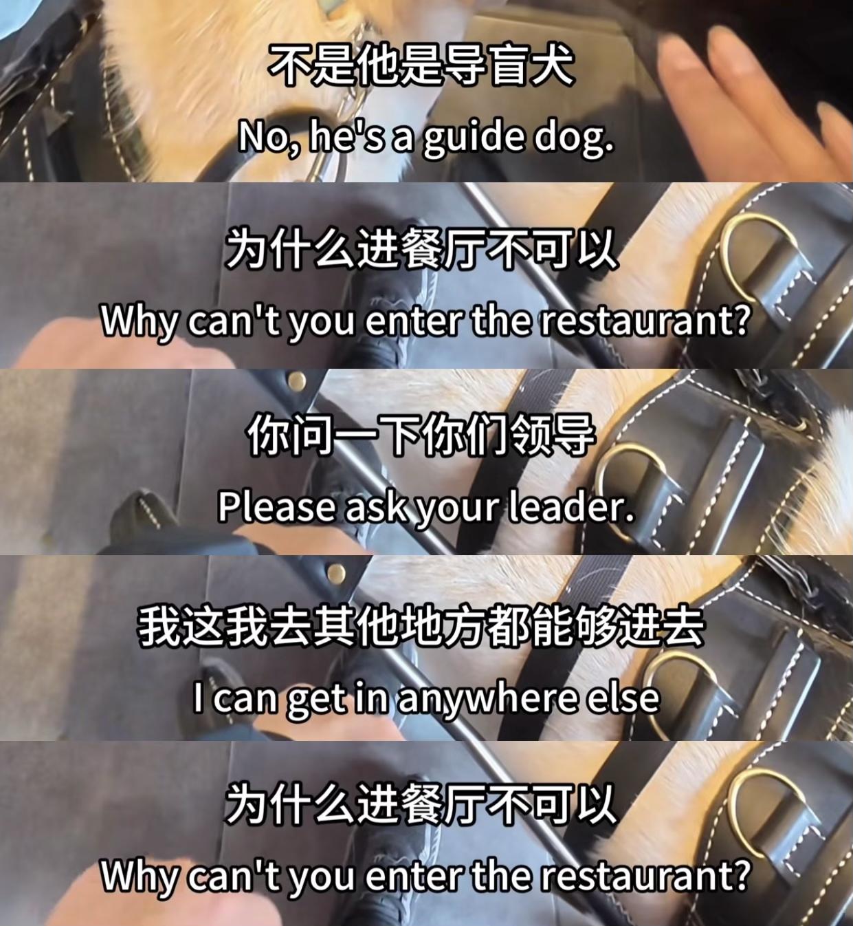 广东一位女盲人带导盲犬出门吃斋饭,餐厅担心影响其它顾客于是安排她们在后门或者门口处就餐,女盲人认为被歧视,剪辑了一条中英双语字幕的视频发到网上曝光这家餐馆(顺带火了一把)。餐厅本意是为其他顾客负责,不满意可以投诉,但吃饭带着记录仪、回家还能剪辑视频、字幕还专门配上了英文,总感觉哪里不对。