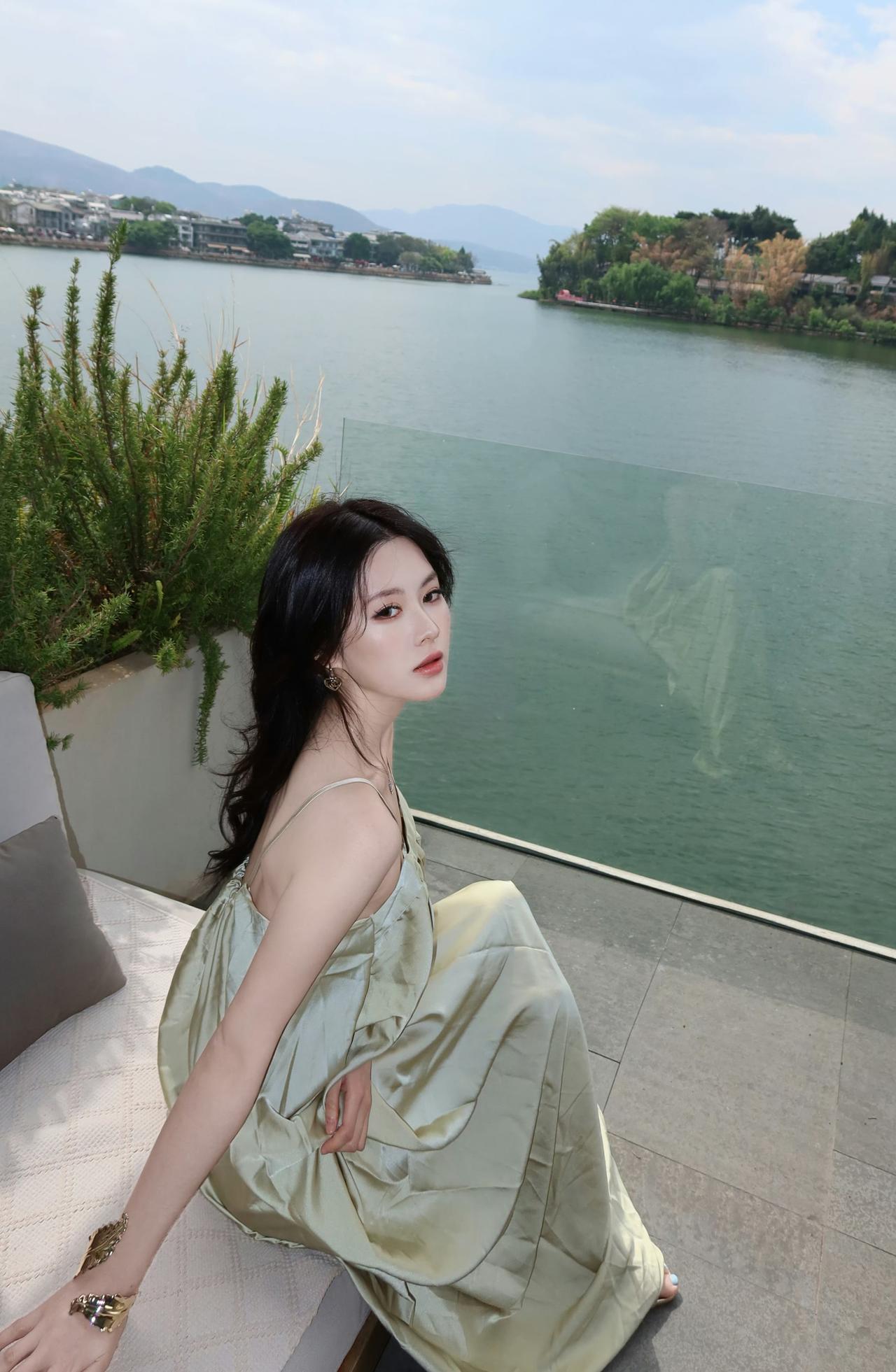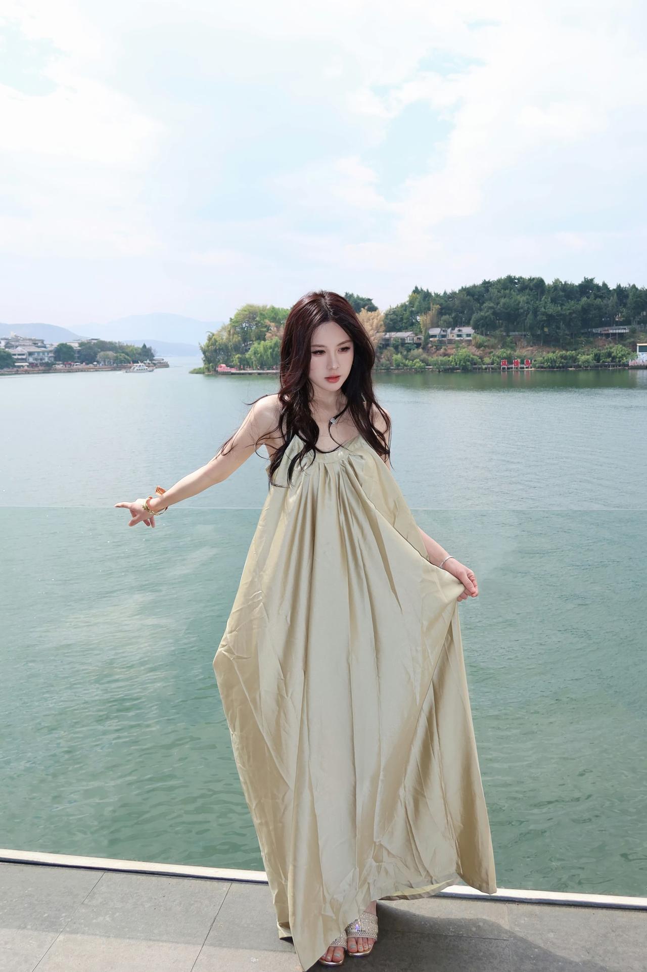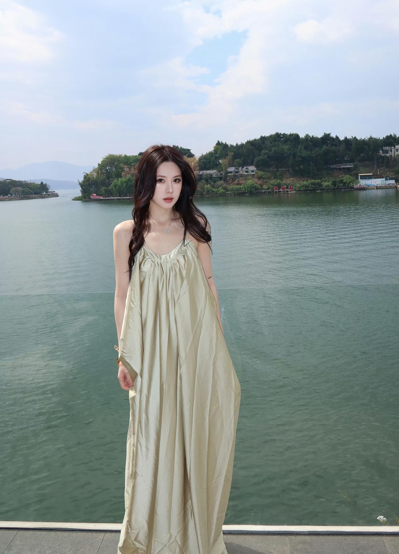 你穿吊带裙的样子,真好看。 香槟色吊带长裙,温柔而又优雅,完美展现出你的气质。