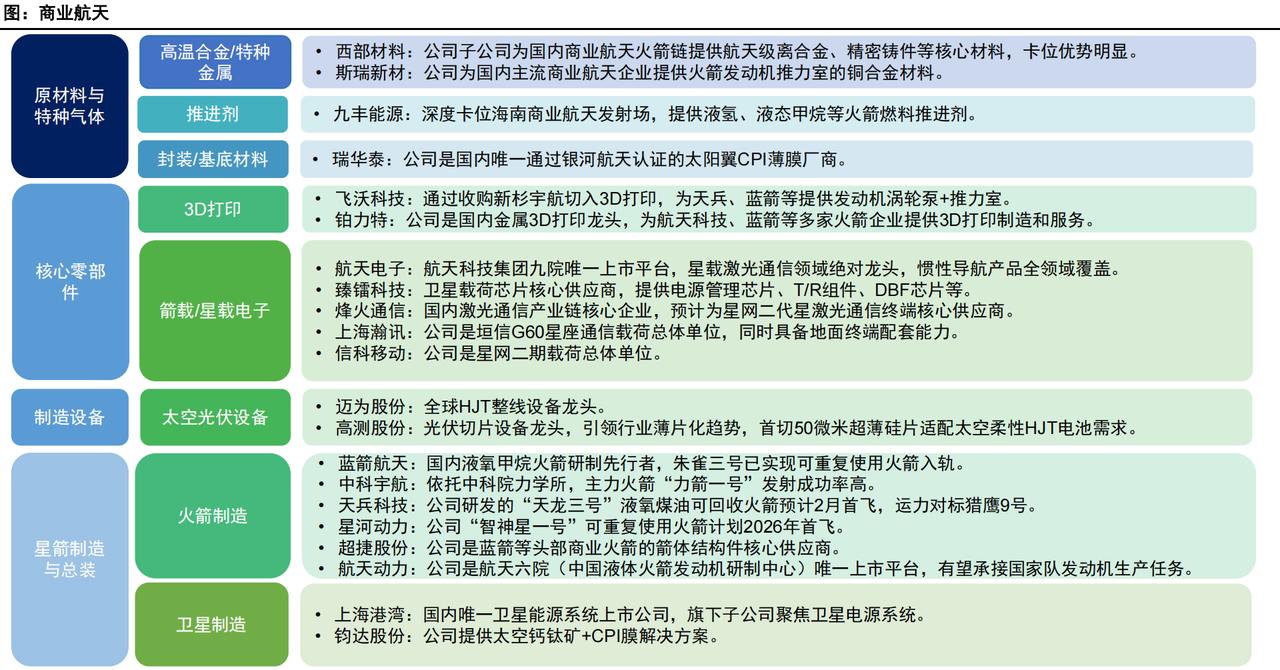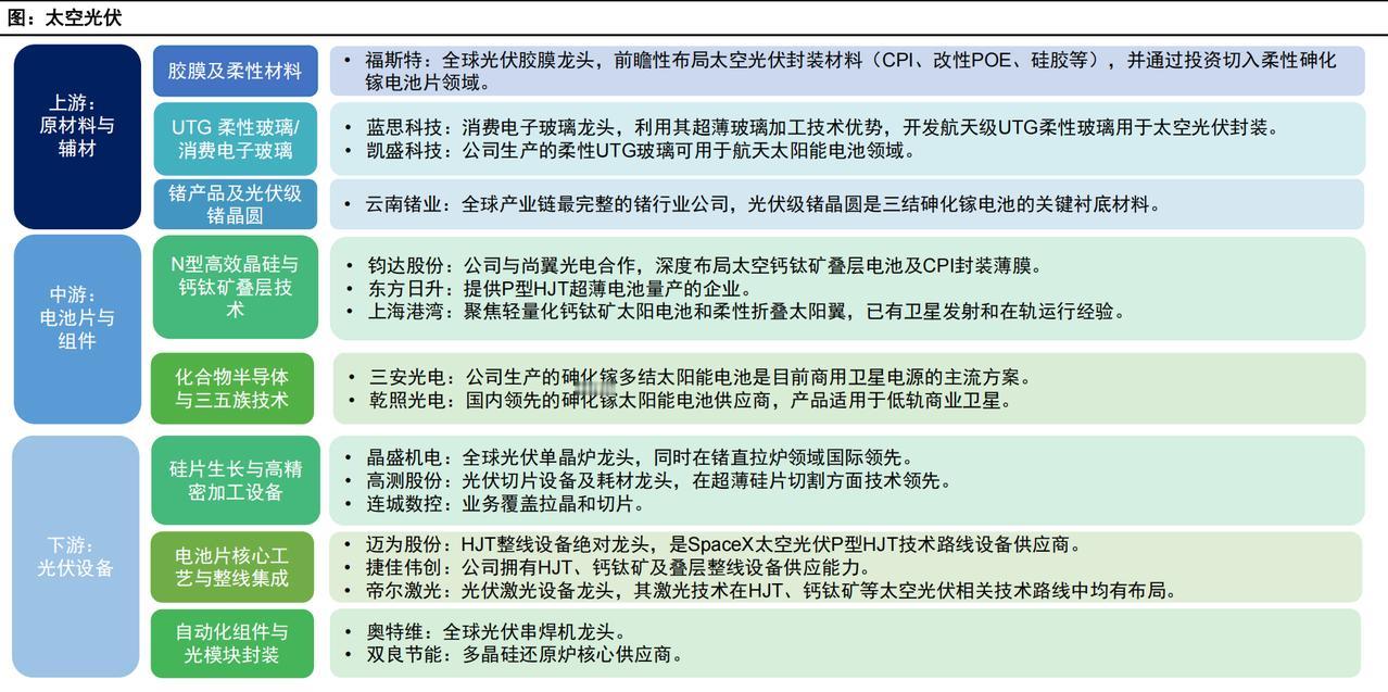 分享一份我认为归纳整理得比较好的相关标的图表给大家。具体分为SpaceX产业链,商业航天产业链和太空光伏产业链。