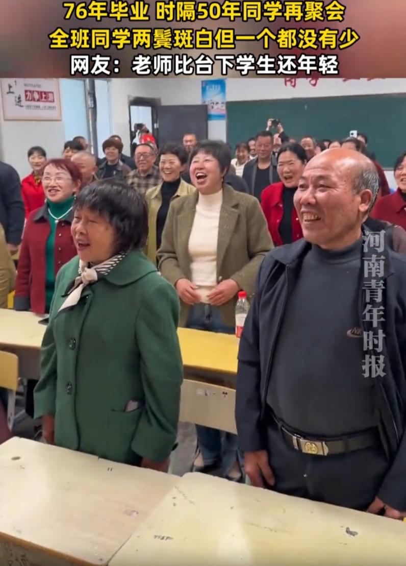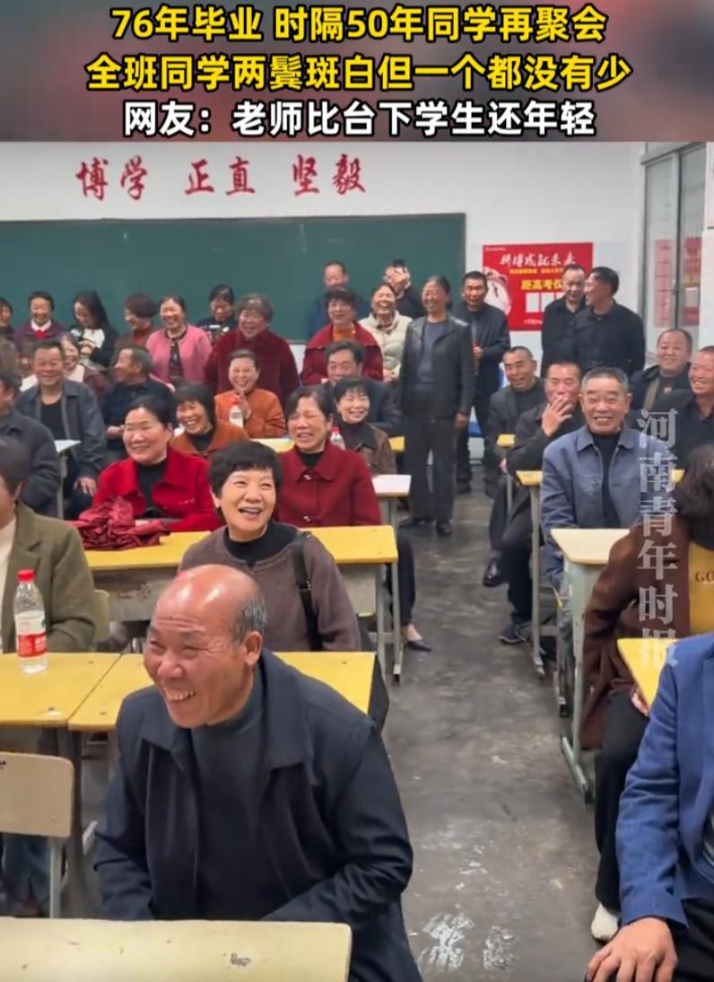 实在太难得了!湖南,一学校组织了一场特殊的师生聚会,一群大叔大妈时隔50年后再次坐到课堂上听老师讲课,虽然年龄上来了,但全班同学却一个都没少