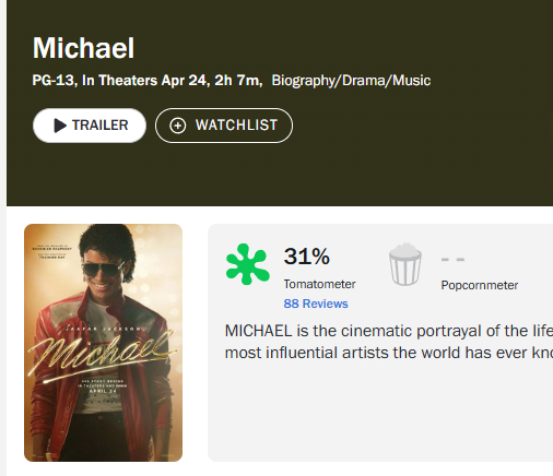 据预期,《迈克尔·杰克逊:巨星之路》全球首周末票房有望突破 1.5 亿美元,市场