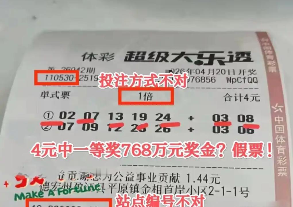 网上又出现一张大乐透第26042期(4月20日开奖)的“一等奖中奖票”,不少人在转发,其实仔细一看就知道是P图造假。