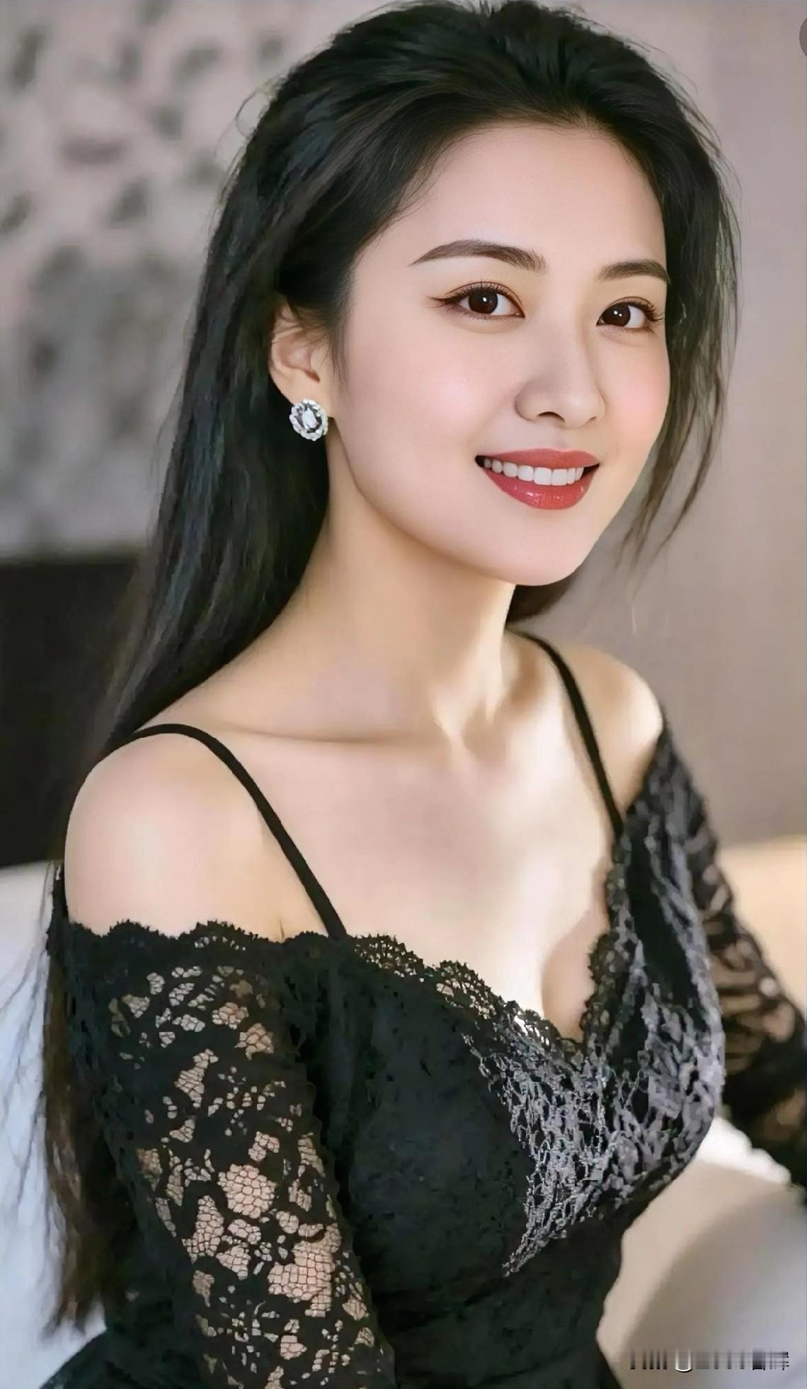 黑蕾丝轻垂,露肩含笑,温柔在光影里静绽。
