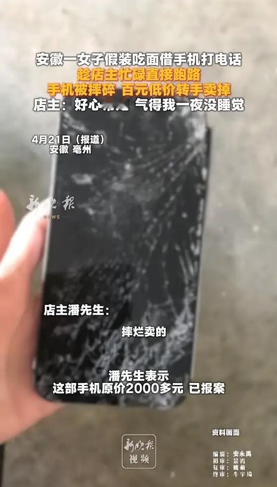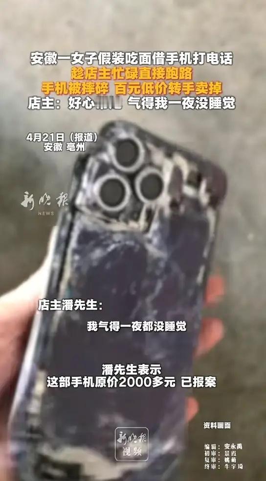 “太缺德了!”近日,安徽亳州,一女子进店点餐,问老板借手机,说要给朋友打电话,老板没多想借给了她,可等老板把女子的餐食端去的时候,发现女子带着手机走了,后来女子把手机摔碎,100元卖给了手机店,气得老板一夜没睡!网友:好心没好报!