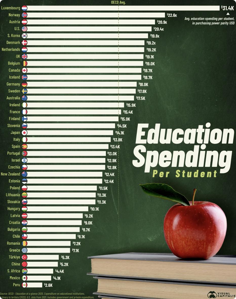 据经合组织(OECD)《教育概览2025》购买力平价调整数据,卢森堡以每生31,439美元高居榜首,比第二名挪威(22,558美元)高出近9,000美元,并在教师薪资方面同样领先全球。奥地利20,942美元、美国20,387美元、韩国19,805美元依次排列,英国、加拿大、德国等西欧及北美主要经济体普遍集中在18,000至21,000美元区间。