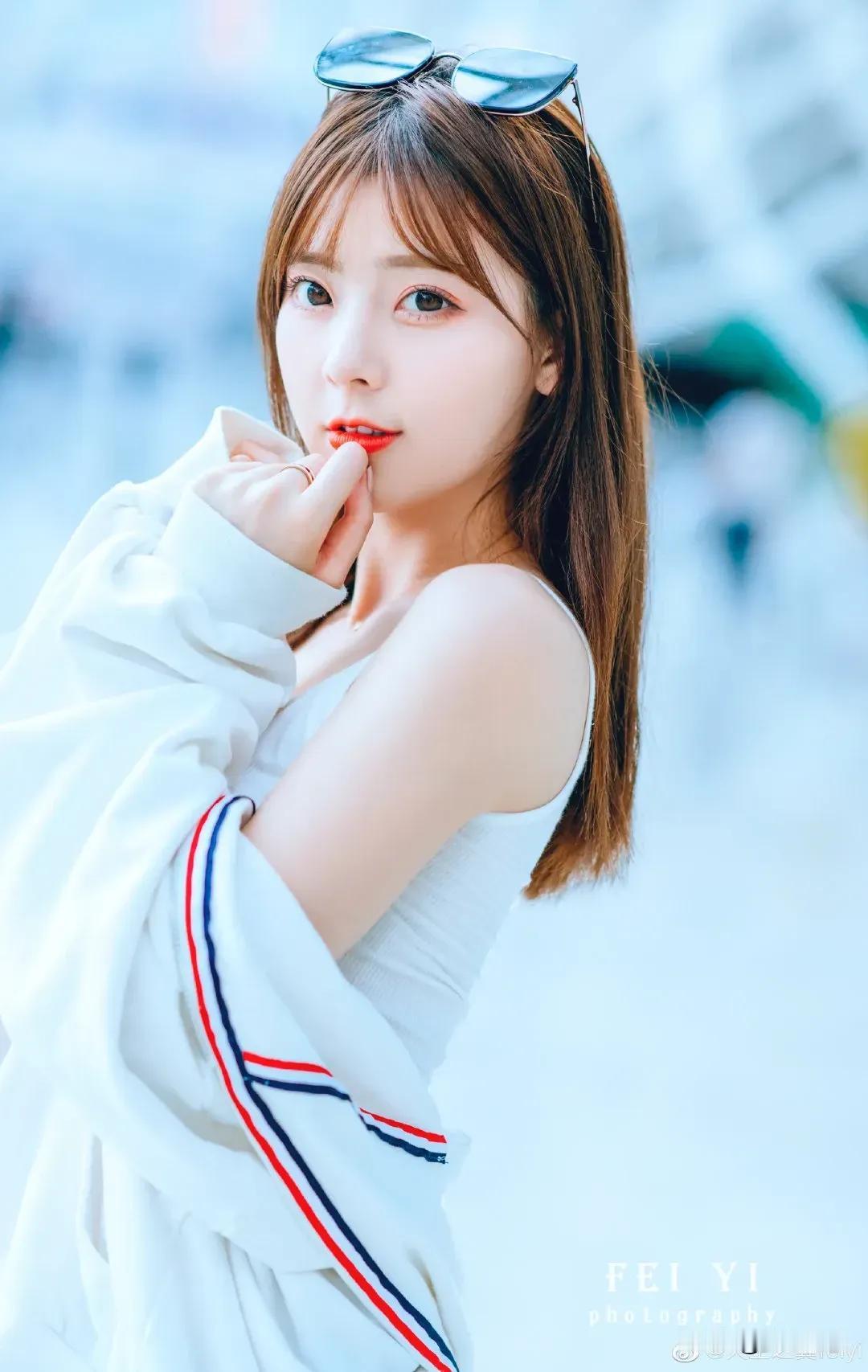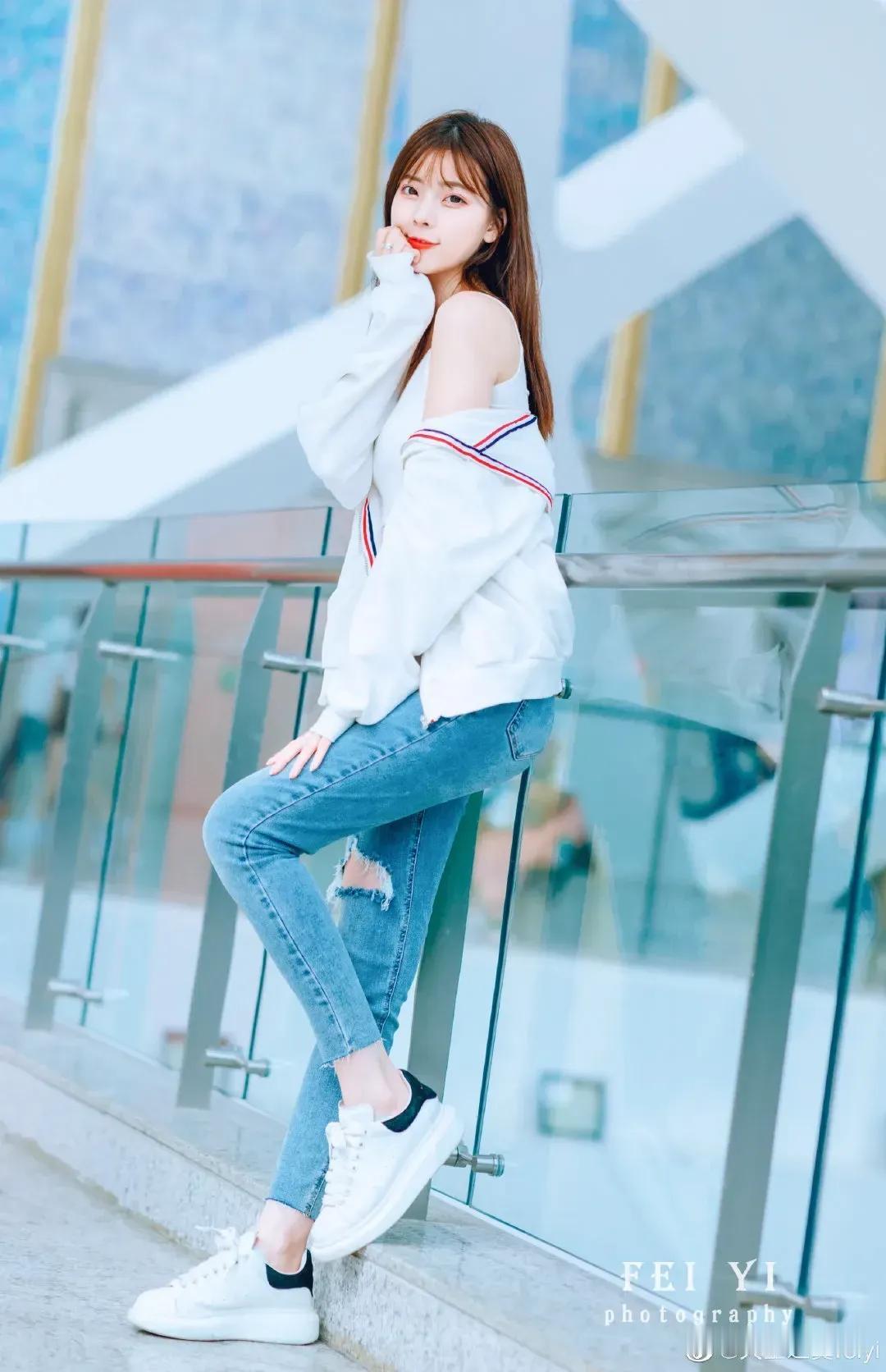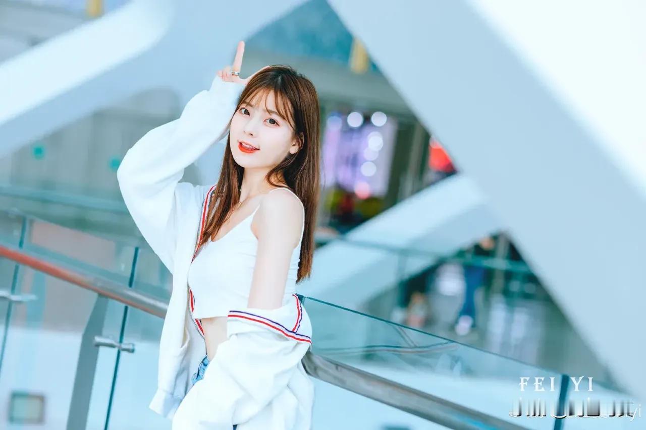 阳光明媚的午后,少女在现代建筑前摆出甜美姿势,FEI YI摄影。 春晓写真[给力