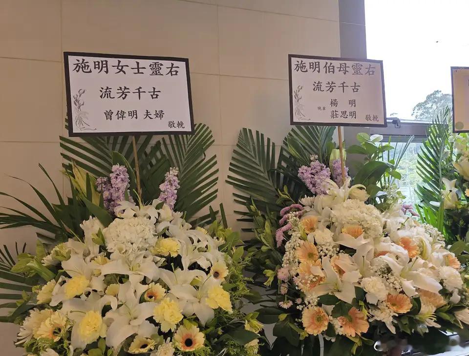 李家鼎前妻施明上月因肺炎病逝,終年74歲,今日(22號)於大圍一間殯儀館設靈。靈堂佈置簡潔,遺照係施明半側身相片,橫匾寫上「轉生淨土」。大堂正中放置大仔李泳漢夫婦嘅花圈,兩側分別係鼎爺同細仔李泳豪嘅花圈。不過,泳豪所送花圈上嘅太太名字疑似被消失,而靈堂外寫明「私人聚會 非請勿進」,各界致送嘅花圈則放滿內外。