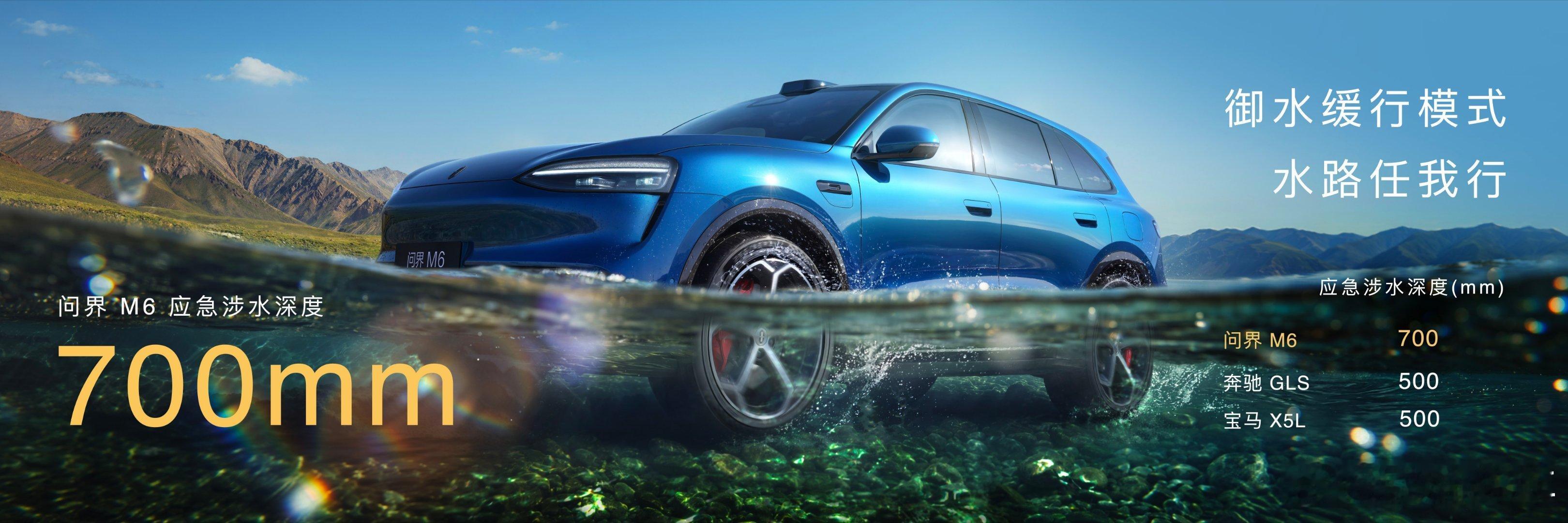 鸿蒙智行发布会 问界M6全系标配华为途灵平台,前双叉臂独立悬架搭配后五连杆独立悬架。全系标配闭式空气悬架搭配连续可变阻尼减振器,搭载道路预瞄,冲击感降低15%。搭配HUAWEI DATS 3.0,打滑程度降低60%,一路开,一路稳。支持御水缓行模式,应急涉水深度达700mm,“水路任我行”。猫头鹰极致转向可实现最小5.5m转弯半径,窄路掉头也能从容一把过。问界M6动态评测首发 广州·大湾区体育馆