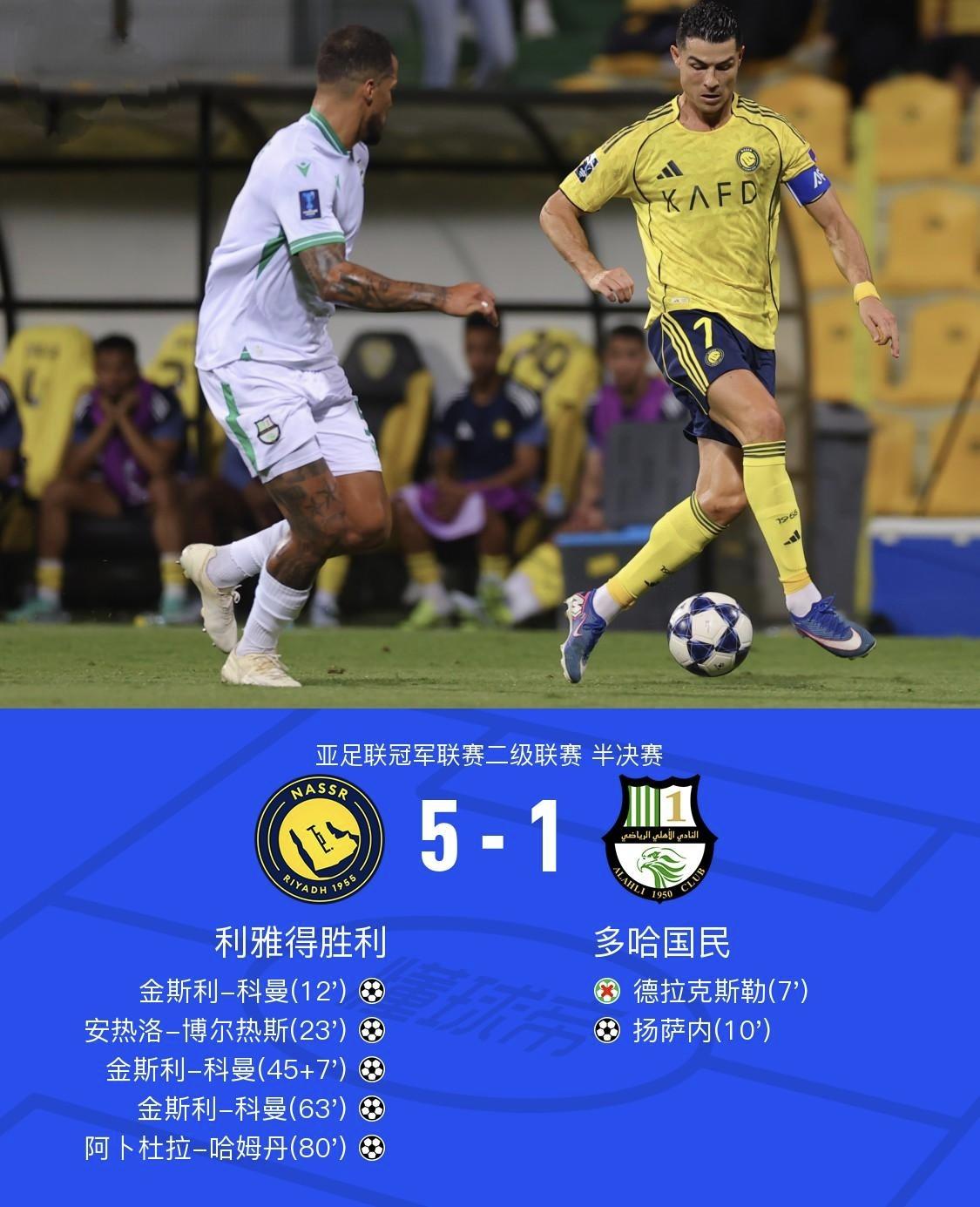 5-1, C罗所在的利雅得胜利,在亚冠二级联赛半决赛中,大胜对手多哈国民,从而成功晋级决赛,不过本场首发出战的C罗丧失了一次绝好的单刀机会,没能完成破门。而本赛季加盟球队的科曼,上演了精彩的帽子戏法,以一己之力帮助球队获得了比赛的胜利。