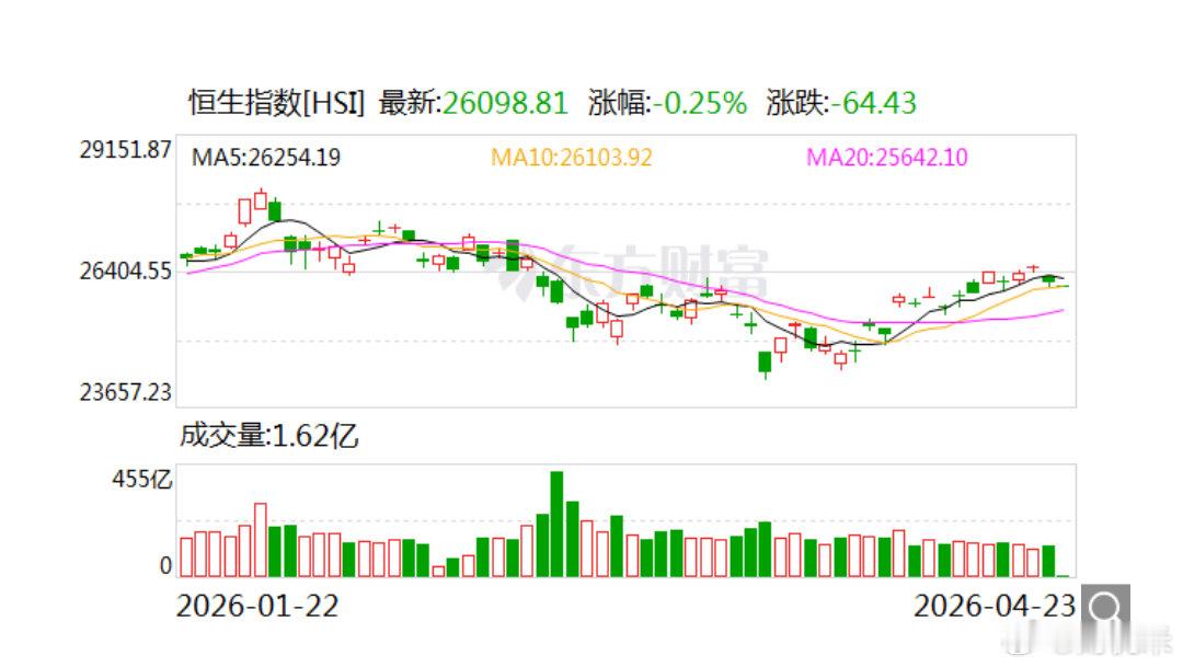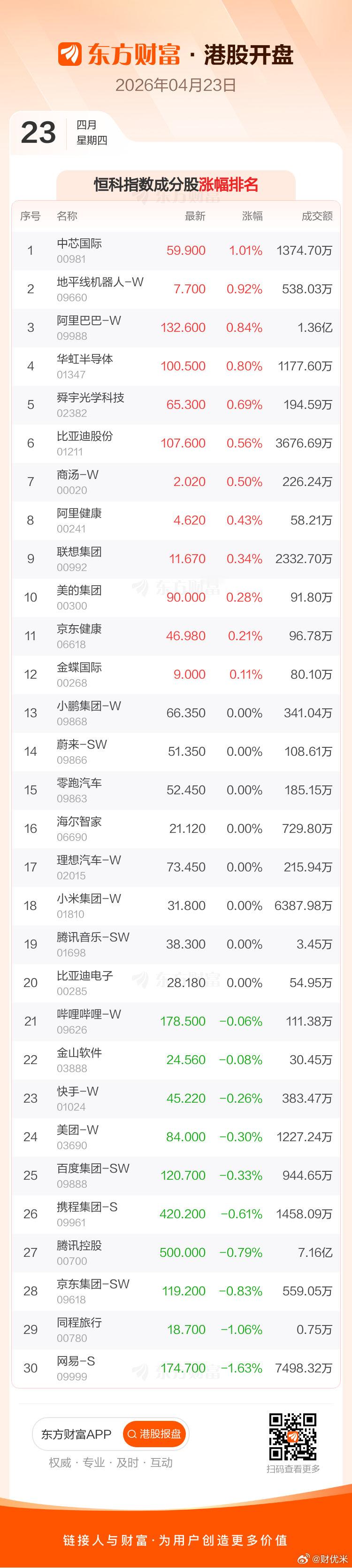 4月23日港股开盘:恒指低开0.25% 网易-S领跌成分股东方财富Choice数据港股4月23日低开,恒生指数开盘报26098.81点,跌64.43点,跌幅0.25%;恒生科技指数开盘报4962.08点,跌1.86点,跌幅0.04%。恒生指数成分股中中芯国际、阿里巴巴-W、中国宏桥涨幅居前,网易-S、吉利汽车、汇丰控股跌幅靠前。恒生科技指数成分股中中芯国际、地平线机器人-W、阿里巴巴-W涨幅居前,网易-S、同程旅行、京东集团-SW跌幅靠前。上证指数 声明;以上不构成投资建议仅供参考