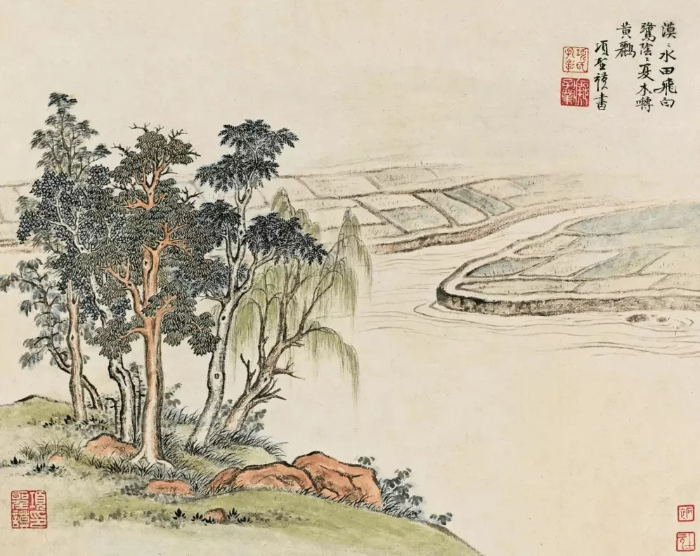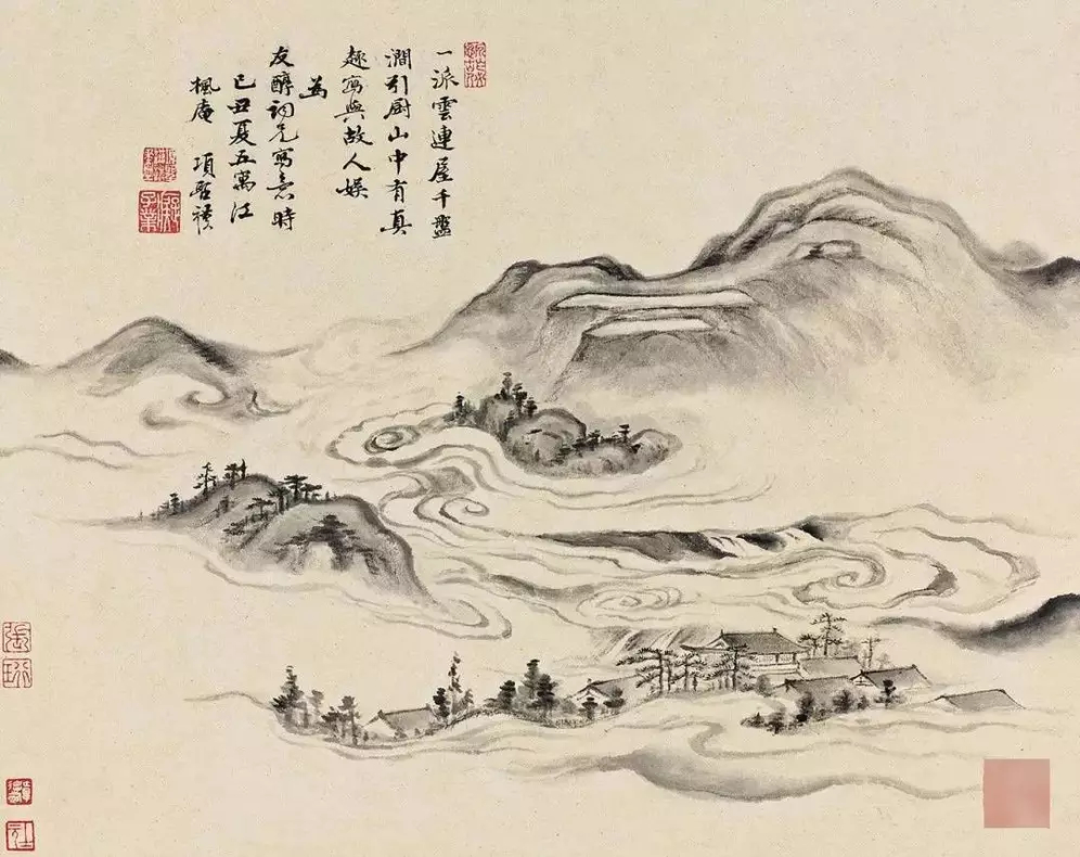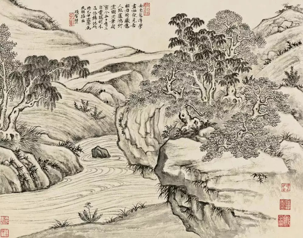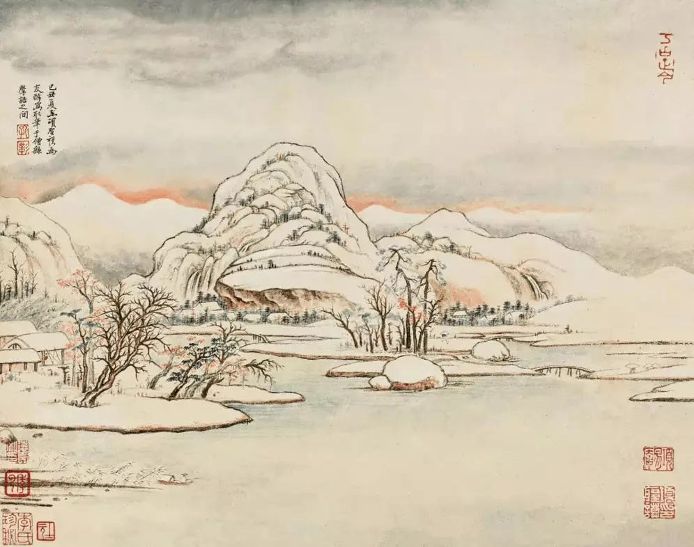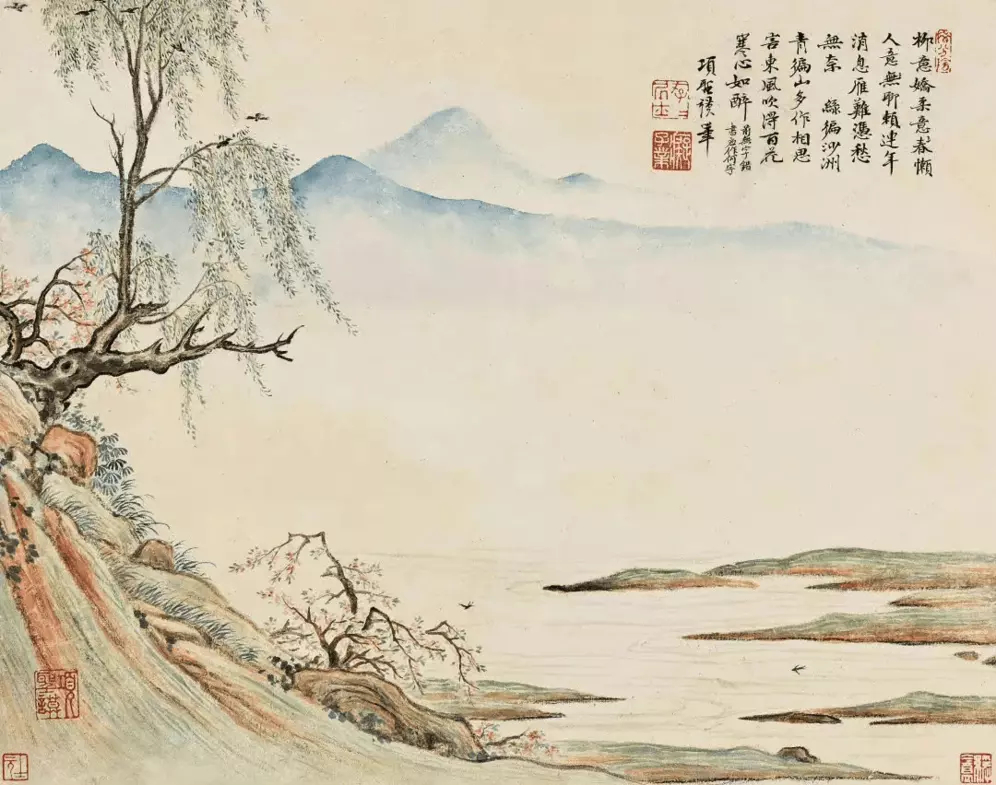 明末 项圣谟《四季山水册页八开》,项圣谟为友醇祠兄所绘。项圣谟对于此套册页的绘制,十分精心,时间跨度也很长,从夏日一直绘到了霜降。