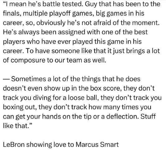 詹姆斯赞美斯玛特:“我的意思是,他经受过大战的考验。一个打过总决赛、多次季后赛、生涯经历过无数大场面的球员,所以他显然不惧怕关键时刻。在他的职业生涯中,他经常被安排去防守这项运动史上最好的球员之一。拥有这样的球员,也会给我们球队带来很大的镇定。