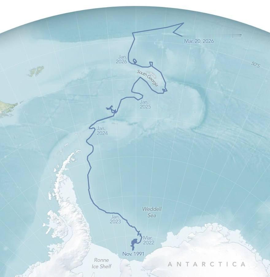 有趣的是,这座冰山早在1986年就从南极洲分离出来,数十年来一直搁浅,直到2023年才重新开始漂移。当时它的面积约为4170平方公里。
