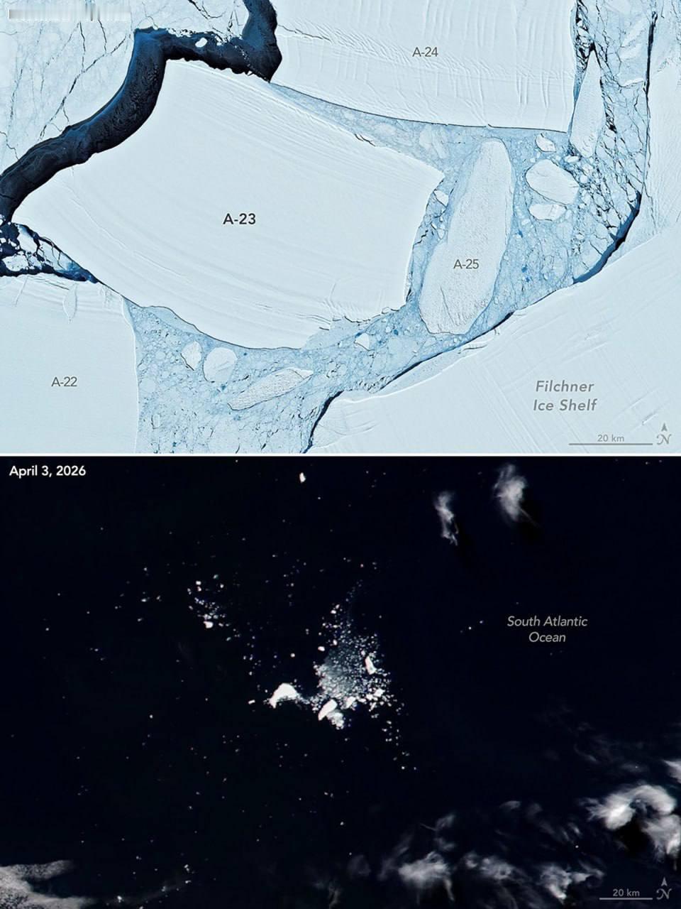 今年1月时,A23a的面积约为1300平方公里,而如今其残余部分不足50平方公里。仅在过去三个月间,其碎片就漂移了约1000公里,穿越了南大洋与大西洋的分界线,并开始迅速融化。