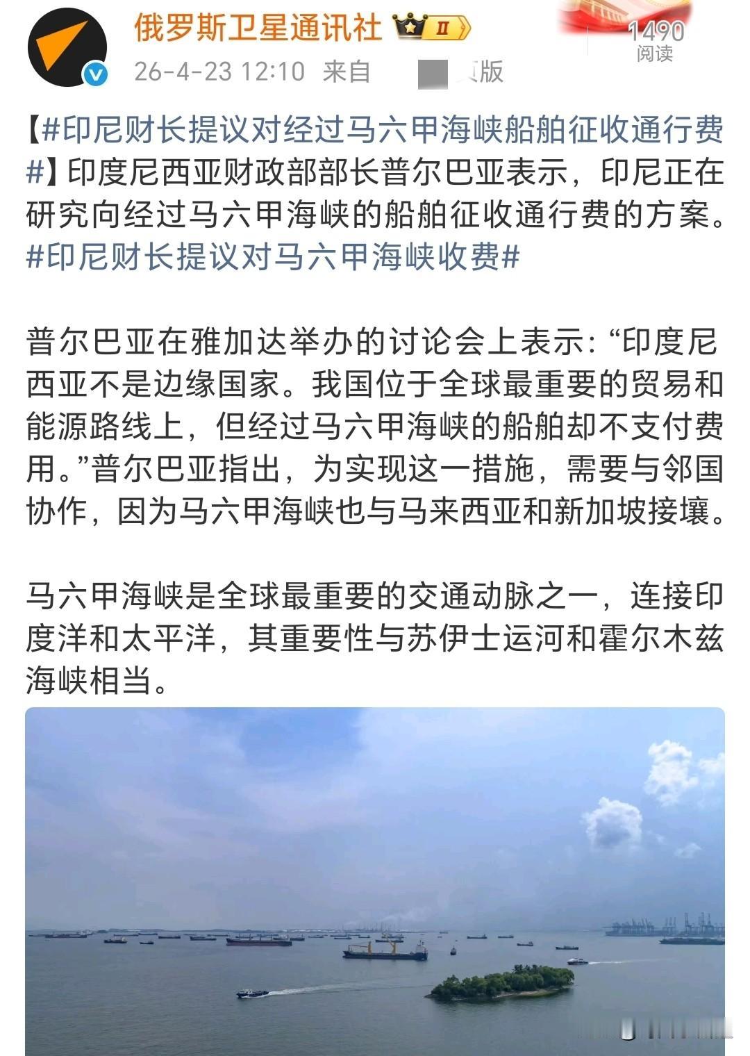 印尼财政部长普尔巴亚在4月22日一场论坛上提出对经过马六甲海峡的船舶征收通行费,引发国际航运界震动,新加坡当天强硬反对并强调此举违反国际法。