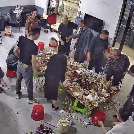 其他人都在有说有笑,而一个身穿白色上衣的男子突然从沙发上站起身来,走到桌子边,二话不说,直接将桌子掀起来然后又重重的摔在地上,桌子上的碗筷,还有没喝完的啤酒瓶都被震的掉在了地上,饭菜也洒的到处都是。