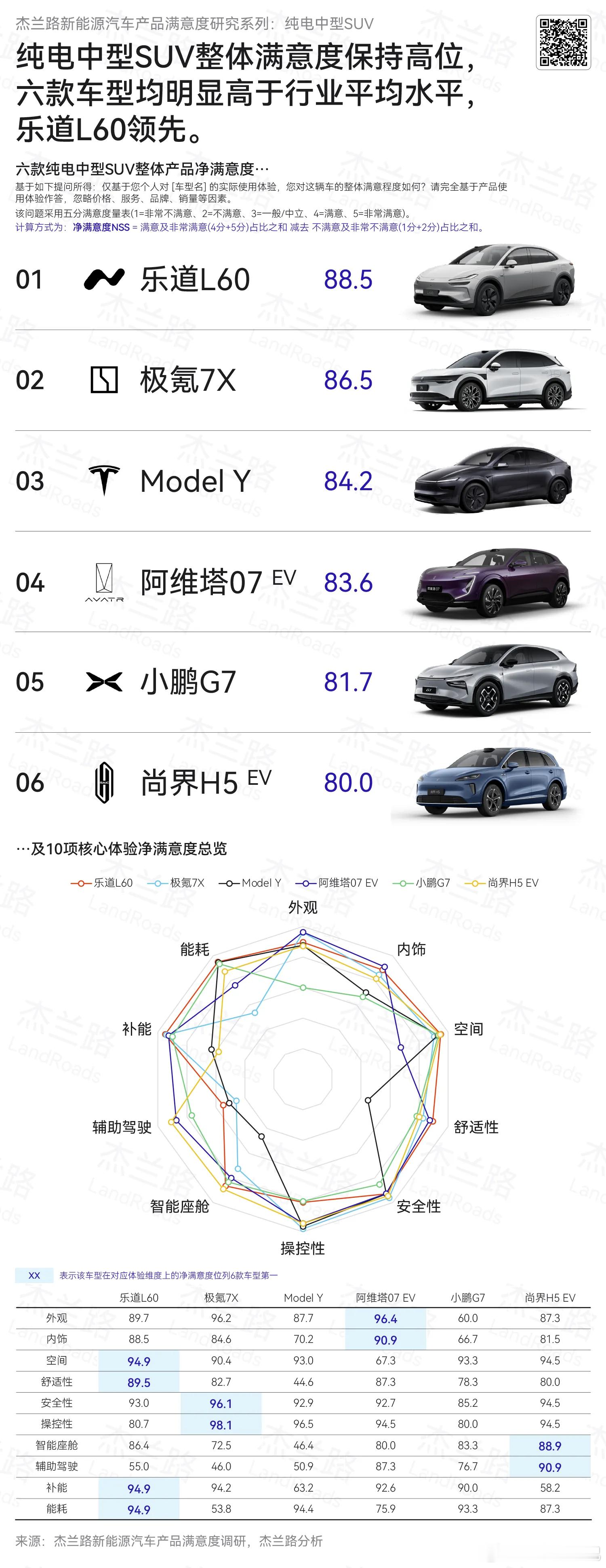 杰兰路发布纯电中型SUV车型满意度研究报告乐道L60获产品净满意度第一,其中在空间、能耗、补能、舒适性四项重点产品体验维度位列分项第一。同期杰兰路保值率数据,采用租电方式购买的乐道L60保值率表现尤为亮眼,超越同级标杆Model Y。依托蔚来纯电技术累积,乐道L60综合产品力获得市场与用户口碑双验证。真实口碑加冕,乐道L60已然成为纯电中型SUV一步到位的首选。