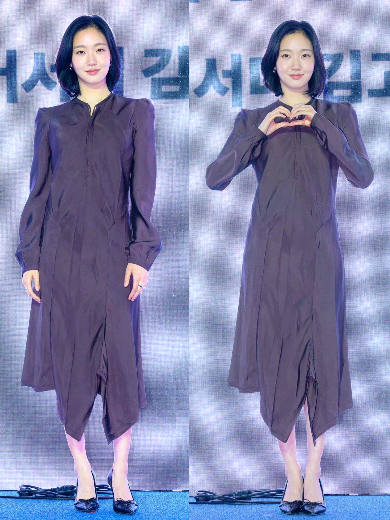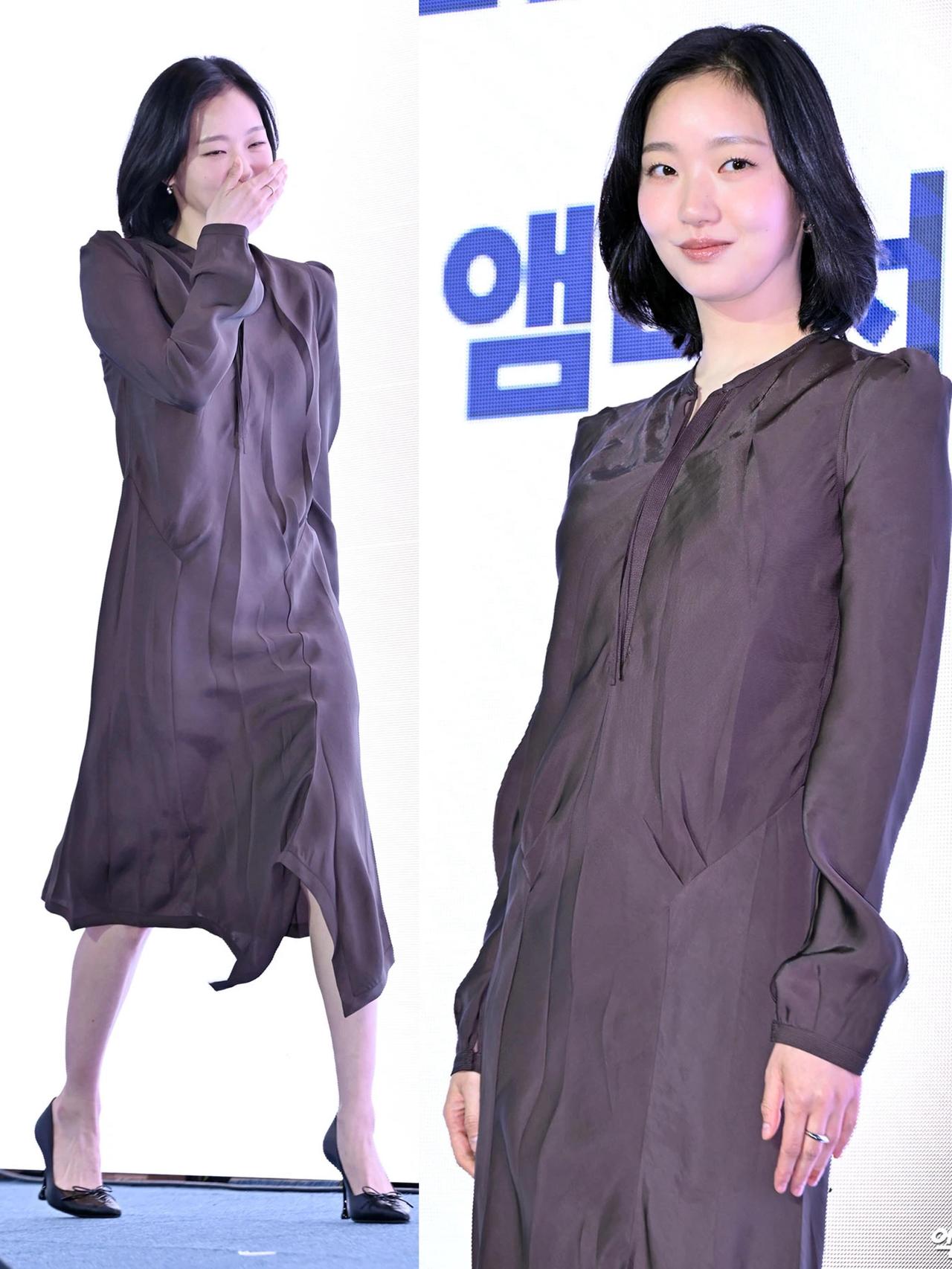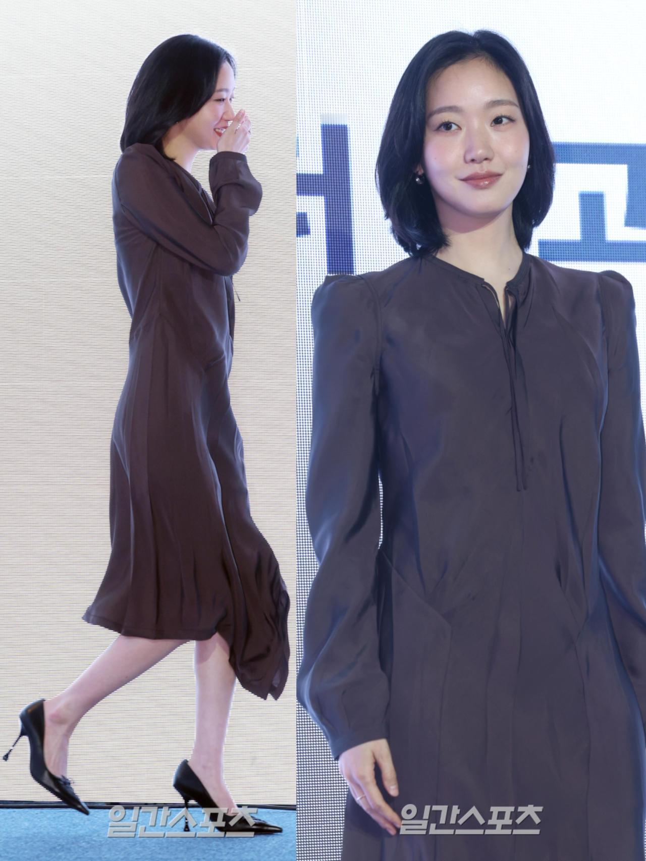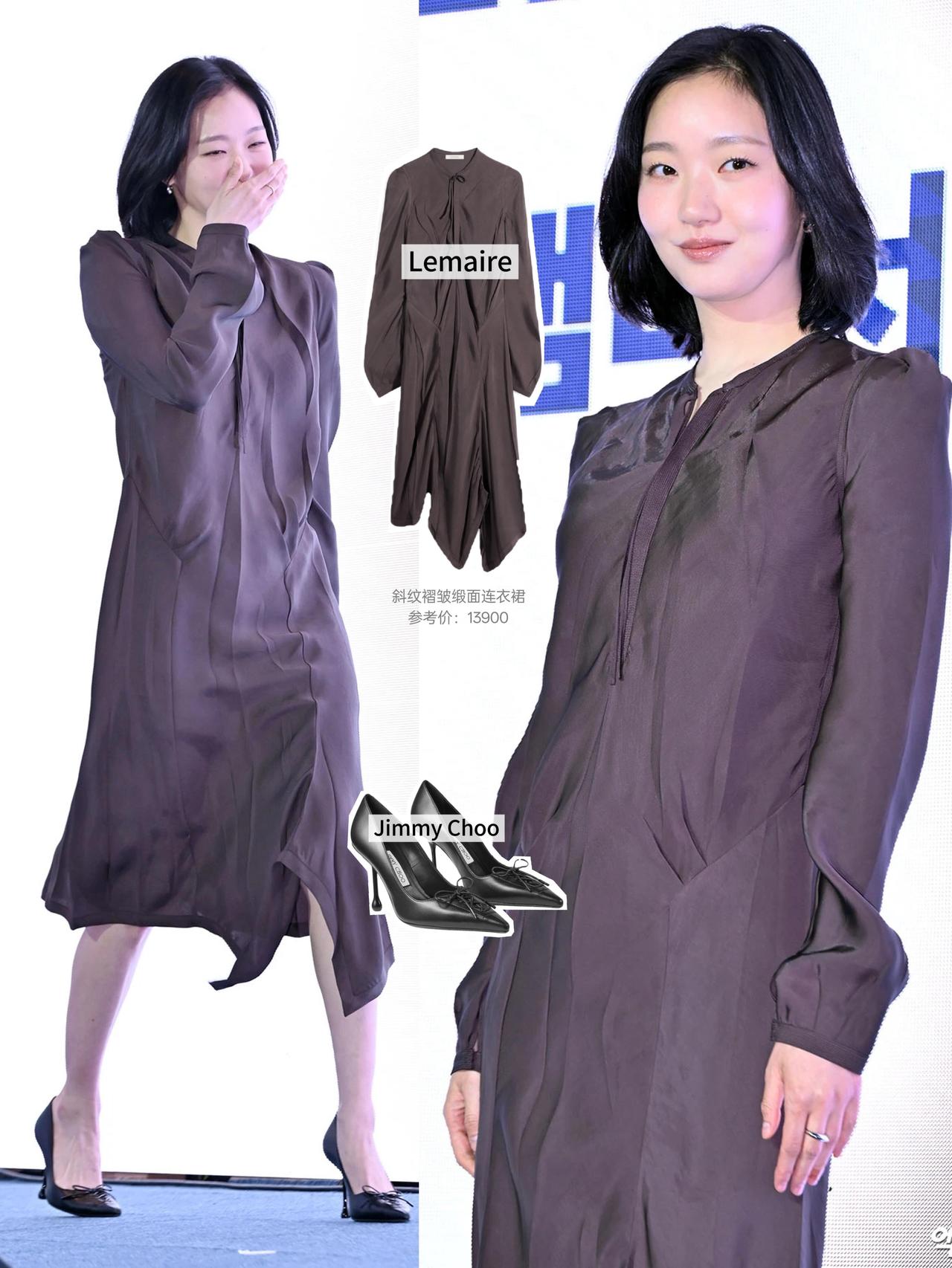 她身穿深棕缎面连衣裙,垂坠感面料自带柔和光泽,不规则裙摆随性又高级,搭配尖头高跟鞋,衬得身姿纤细修长。利落短发与低饱和色调呼应,妆容清透温柔,没有多余装饰,却把松弛知性的气质拉满,简约又显贵的造型太适合她了。