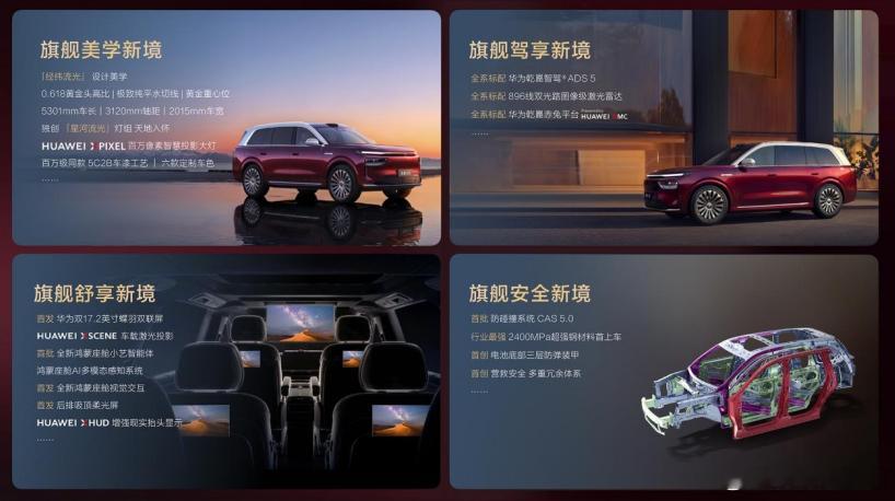 外观设计上,奕境X9采用专属“经纬流光”设计语言,精准把控0.618黄金头高比、极致纯平水切线与黄金重心位,打造优雅舒展、气场十足的旗舰车身姿态;搭载全套星河流光智能灯组,其中前贯穿灯长度达1.83米,为行业最长的变截面一体化贯穿灯;尾灯由1172颗行业最小规格ISD灯珠组成,点亮后呈现星河质感,车流辨识度拉满;搭载HUAWEI XPIXEL百万像素智慧投影大灯,标配专属“步步星河”迎宾灯语,为用户带来专属奢享的用车仪式感;采用百万豪车同级5C2B车漆工艺,每一寸漆面都呈现出百万级豪车的极致质感与耐久光泽。产品核心实力上,奕境X9依托东风汽车深厚造车积淀与华为乾崑全栈智能技术原生共创,全面刷新“安全、舒享、驾享”三大“代际新标准”,为用户带来超越同级的全场景驾乘体验。一是树立旗舰安全新标准。奕境X9全系标配华为乾崑最新一代CAS5.0,车身首次量产应用2400MPa超高强度钢,搭配行业首创三层防弹级电池装甲,以全维度无死角安全防线,将用户出行安全标准提升至全新高度。二是刷新旗舰舒享新标准。奕境X9首发全新一代鸿蒙座舱6,升级智慧交互体验,让智能座舱成为主动服务用户的智能体,兼顾便捷性与舒适性。三是建立旗舰驾享新标准。奕境X9全系标配华为乾崑智驾ADS 5及896线激光雷达,以全主动预判驾驶能力,重新定义高端车型的驾驶乐趣与操控体验。奕境作为华为乾崑与东风联手打造的全新品牌,本次亮相华为乾崑技术大会并重磅发布旗舰车型,充分说明了华为乾崑对这一深度合作成果的高度认可与全力支持。华为智能汽车解决方案 BU CEO靳玉志也在现场对奕境X9给予了极高评价,奕境X9是今年最值得期待的旗舰 SUV,华为乾崑技术大会发布的最新技术,奕境X9全都有!