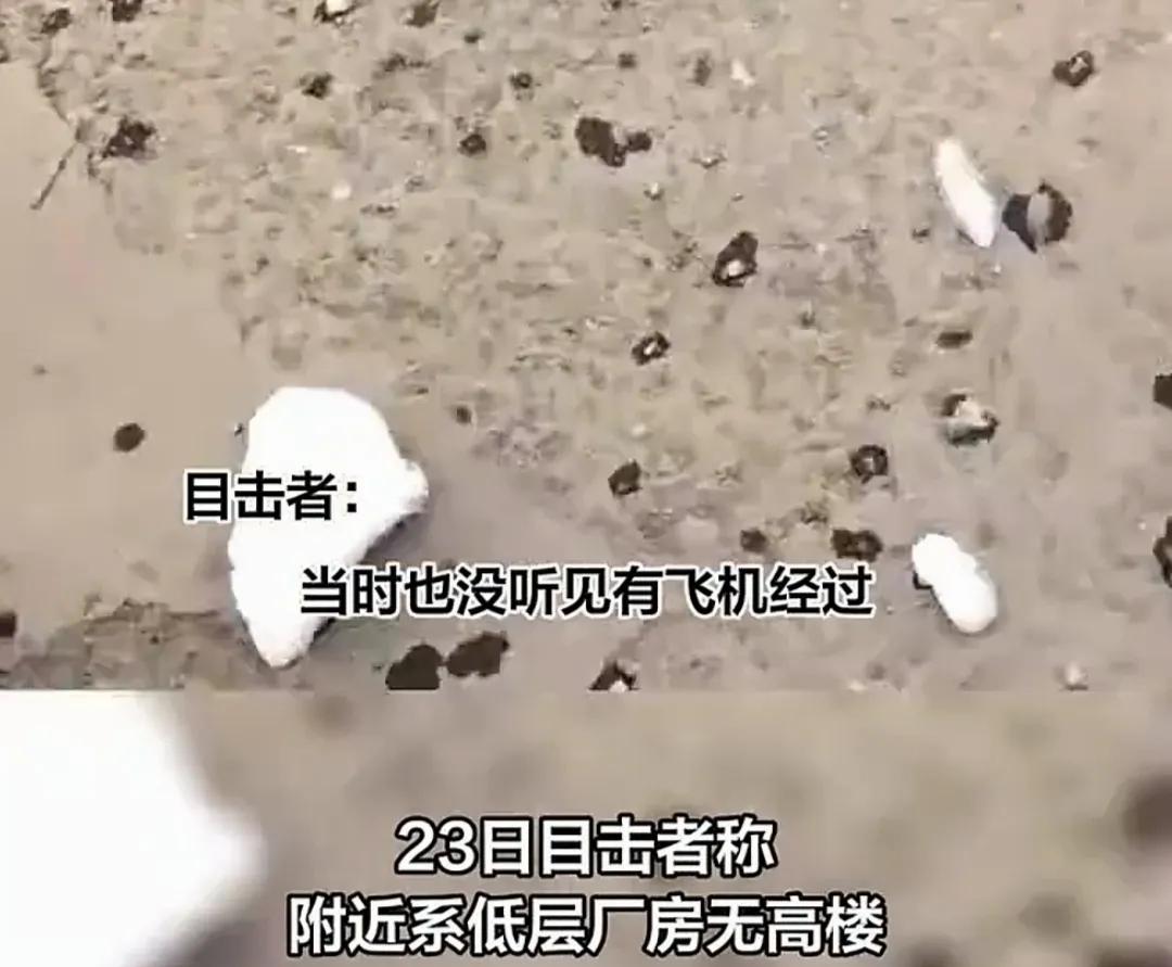 还有就是太空彗星冰块也不可能,飞机厕所蓝冰也不可能。因为如今飞机污水全封闭储存,不会空中排放,且掉落冰块是纯白色,所以也与飞机厕所蓝冰特征完全不符。