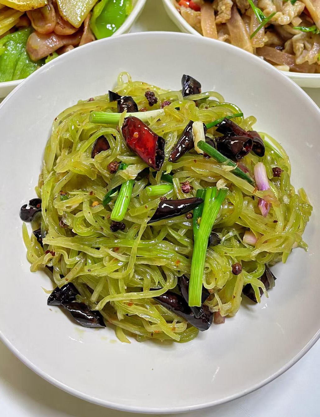 👉 做法:莴笋去皮切细丝;热油爆香蒜末、干辣椒,下莴笋丝大火快炒,加一勺生抽、一勺香醋、少许糖,翻炒30秒就出锅(保持脆嫩)。