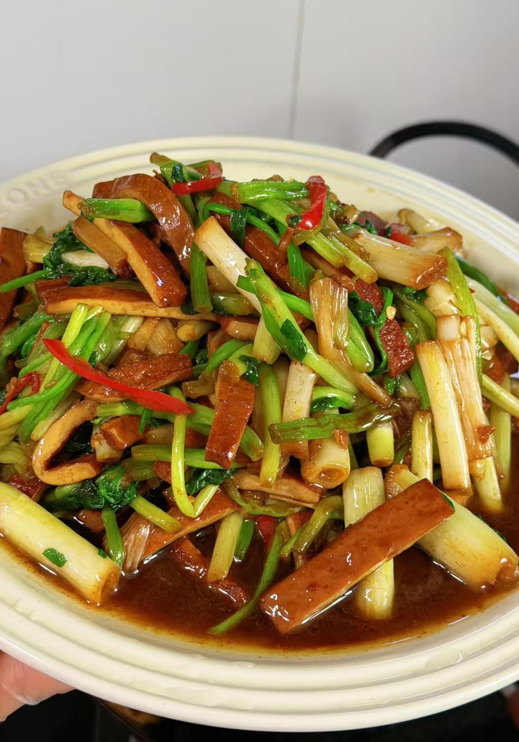 👉 做法:芹菜切段,豆干切条;热油爆香蒜末,下豆干煎到微黄,加芹菜段大火翻炒,淋一勺生抽、少许盐,炒到芹菜断生即可。