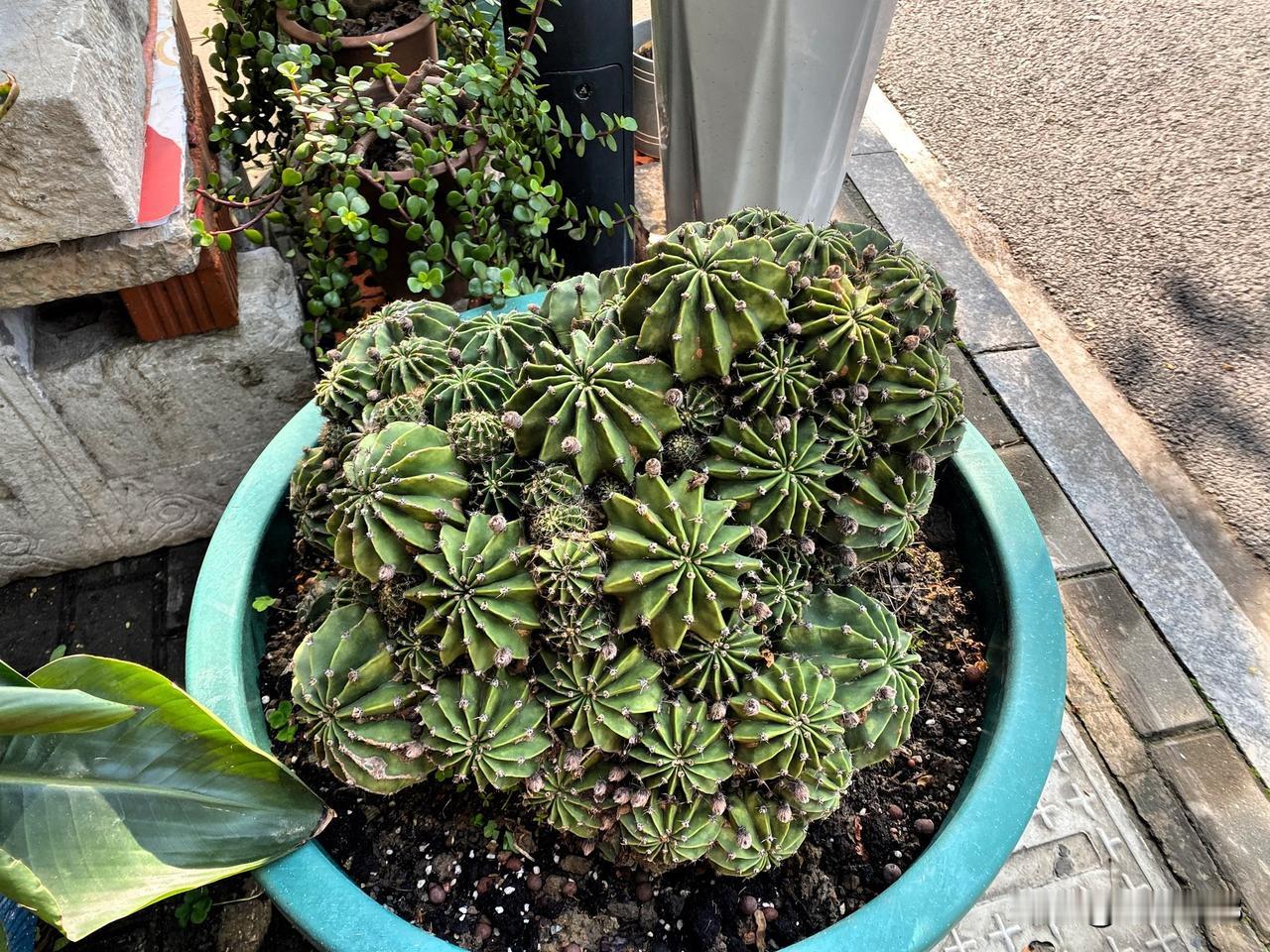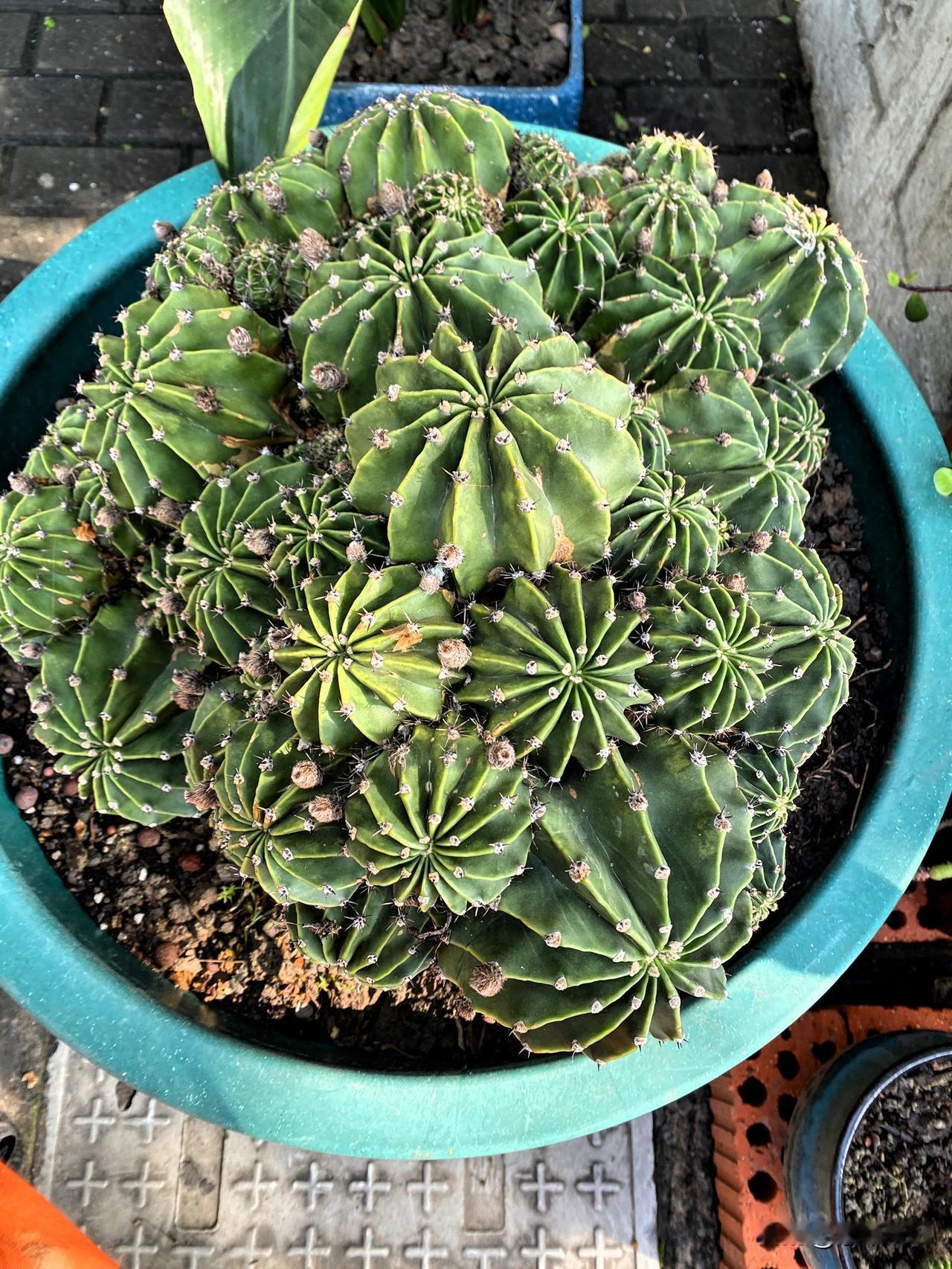 仙人球大群生的造型很好看,所有仙人球大小均匀,看起来很舒服的样子,这样的仙人球远看像山川秀美,期待它繁花盛开的时刻马上到来。