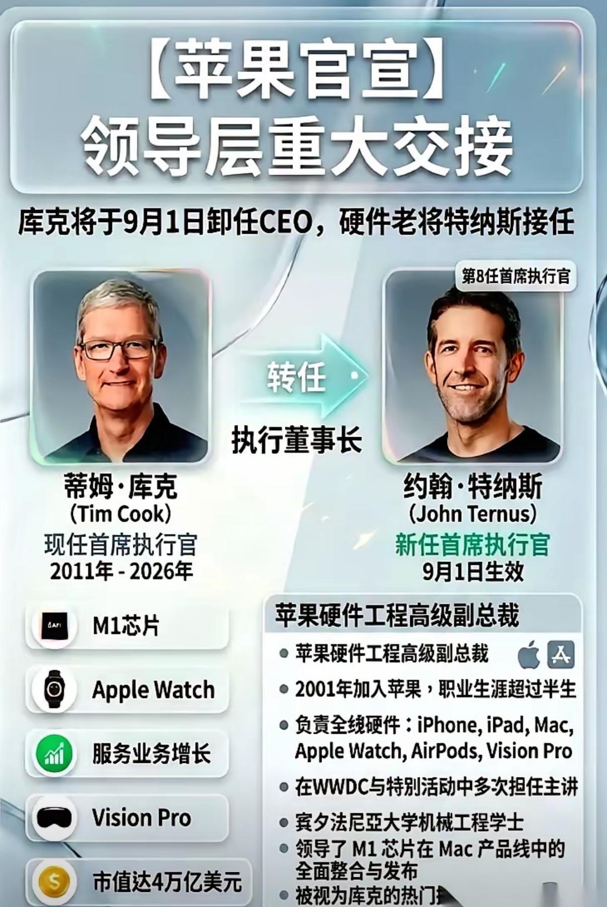 库克没有延续乔布斯的创新路线,而是专注于产品本身,在乔布斯的IPhone 思路内,将产品品质做到极致化,也将苹果的市值增加了十几倍,库克是成功的,苹果手机也是成功的。即使是在乔布斯的设计样板上挤牙膏十几年,也没有被其他品牌给颠覆掉,这能说明什么呢?乔老板确实神一般的存在!如今生态环境不一样了,AI生态下,苹果手机如果不能有革命性的创新,被取代的可能变得越来越大。M芯片的设计者,John Ternus走到了CEO的位置,我期待苹果手机接下来会针对AI有着更大的动作。不过,从挤了十几年牙膏的库克在对IPhone 17这一次有着跨越式的技术释放也能感觉到。仿佛库克时代的一次集中大招的释放。反正最后一次了。秋天的Iphone18会是M级别的芯片吗?观点创作激励赛