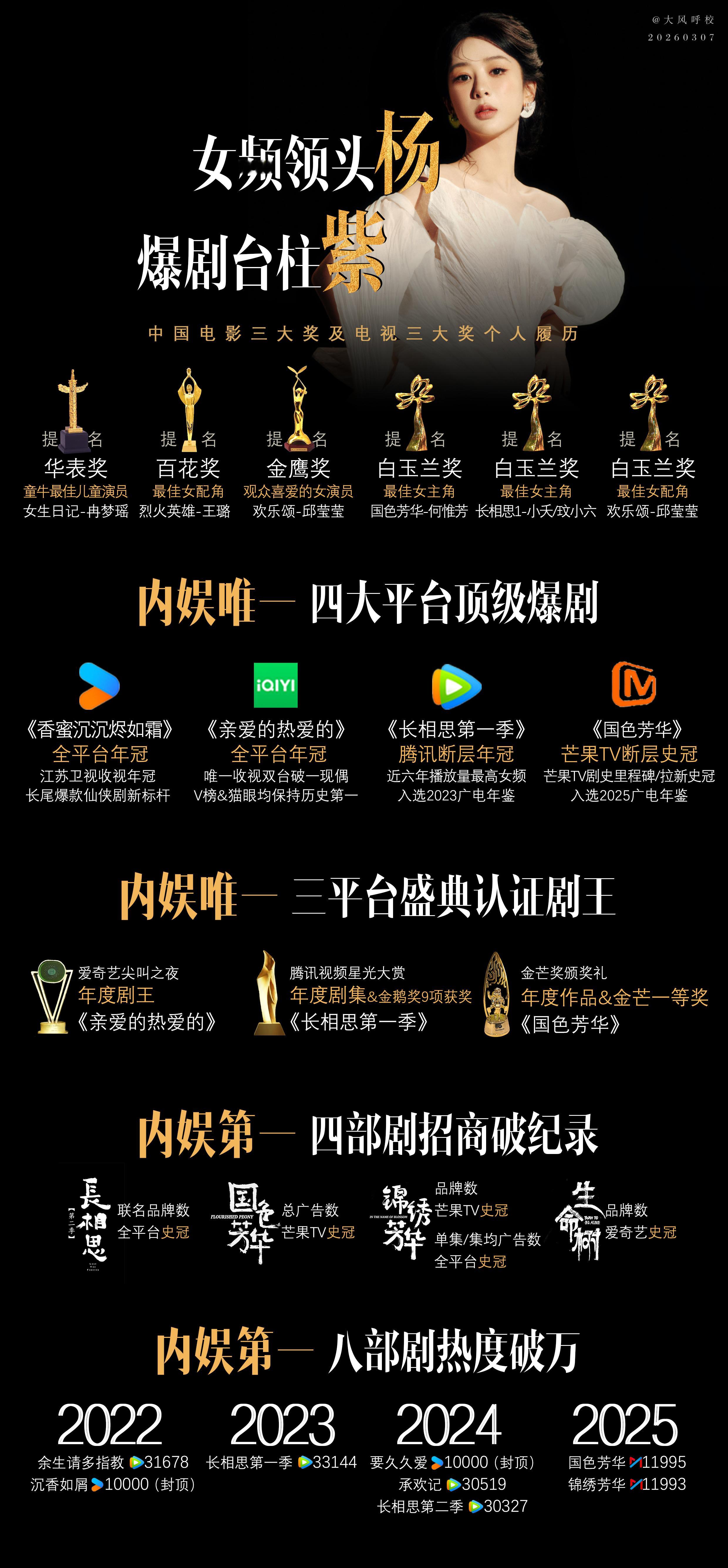 杨紫的扛剧能力确实有目共睹,从口碑收视双丰收的作品,到多部热度破万的剧集,一路用实绩站稳脚跟。既有扎实演技撑住角色,又有国民度带动热度,颜值与实力兼备,难怪能成为观众心中靠谱的收视金字招牌,每一部作品都让人看得放心又过瘾。