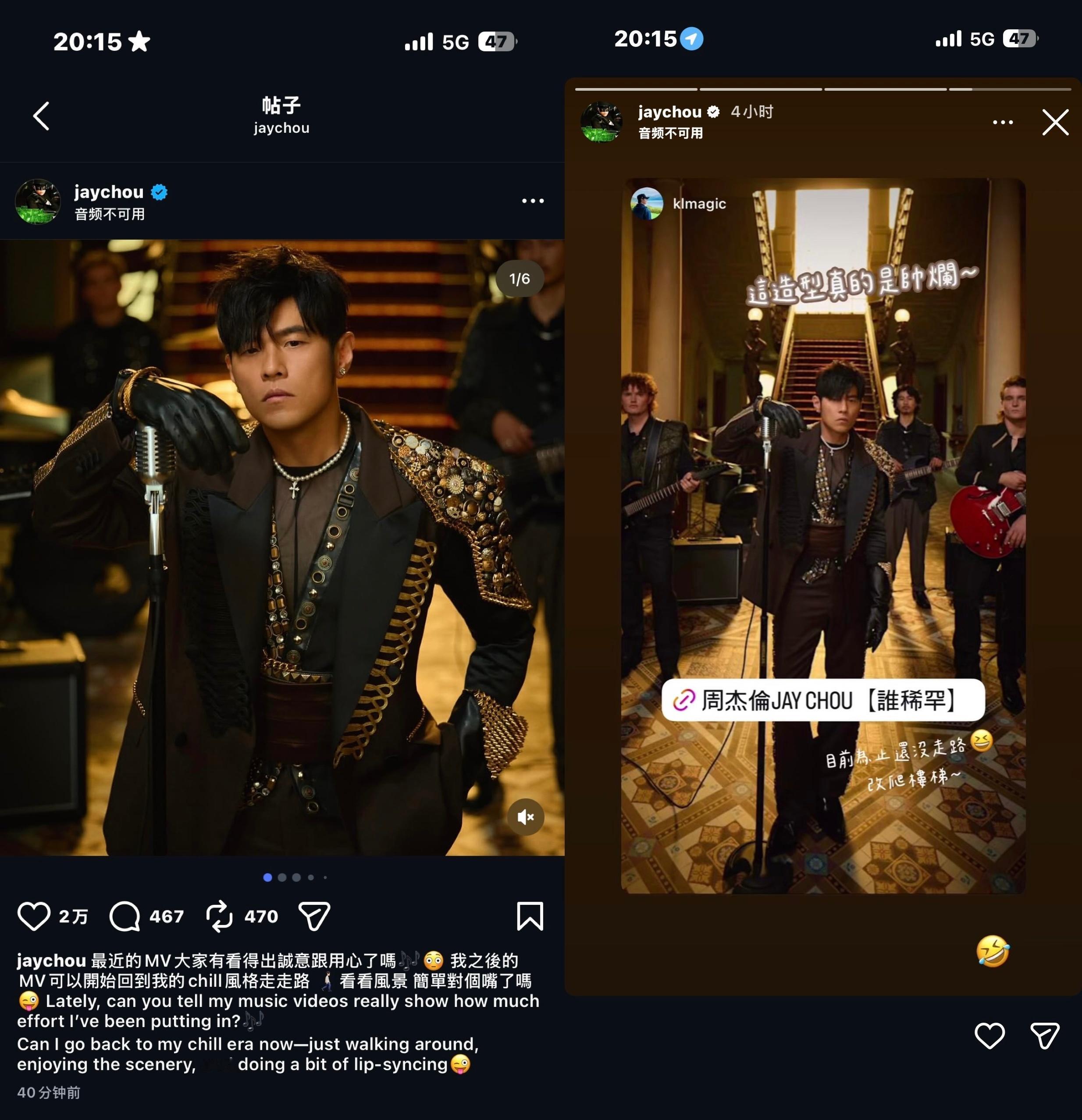 周杰伦 更新IG+快拍:最近的MV大家有看得出誠意跟用心了嗎🎶😳我之後的MV可以開始回到我的chill風格走走路🚶🏻➡️看看風景 簡單對個嘴了嗎😜