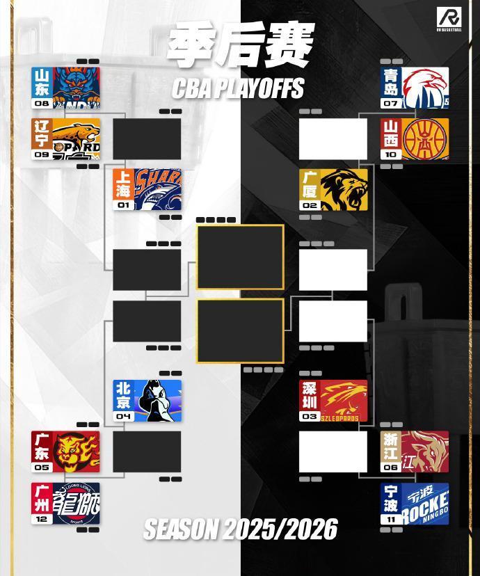 CBA季后赛对阵图: 前四名上海北京一个半区、广厦深圳一个半区。 CBA季后