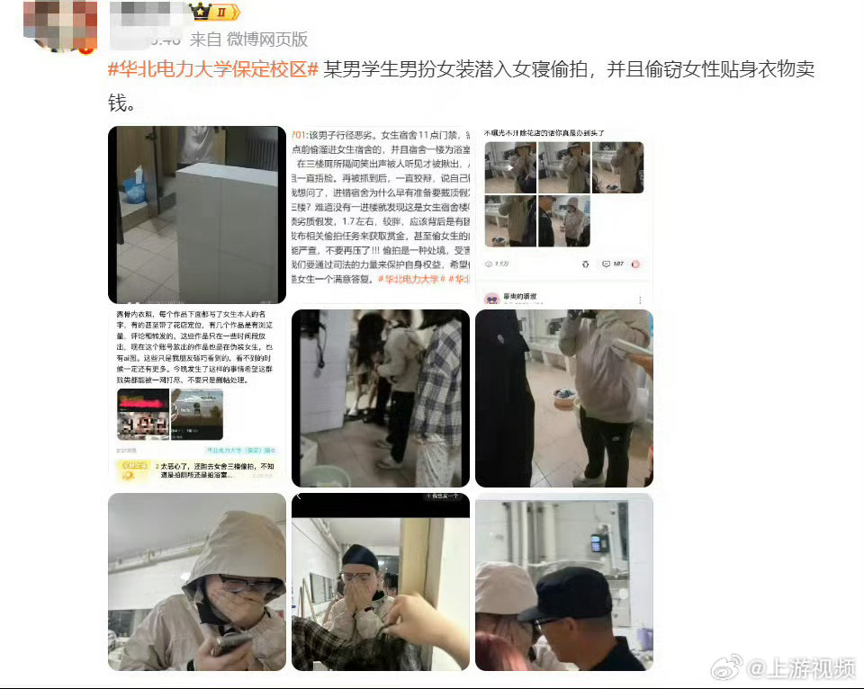 #男生戴假发进女生宿舍偷拍同学发声# 【警方介入男生戴假发进女生宿舍偷拍】#警方回应男生戴假发进女生宿舍偷拍#4月24日,华北电力大学保定校区多名学生在社交平台发帖爆料,称该校一名男生戴假发潜入女生宿舍楼厕所,被当场抓住后,当地派出所已将其带走调查。