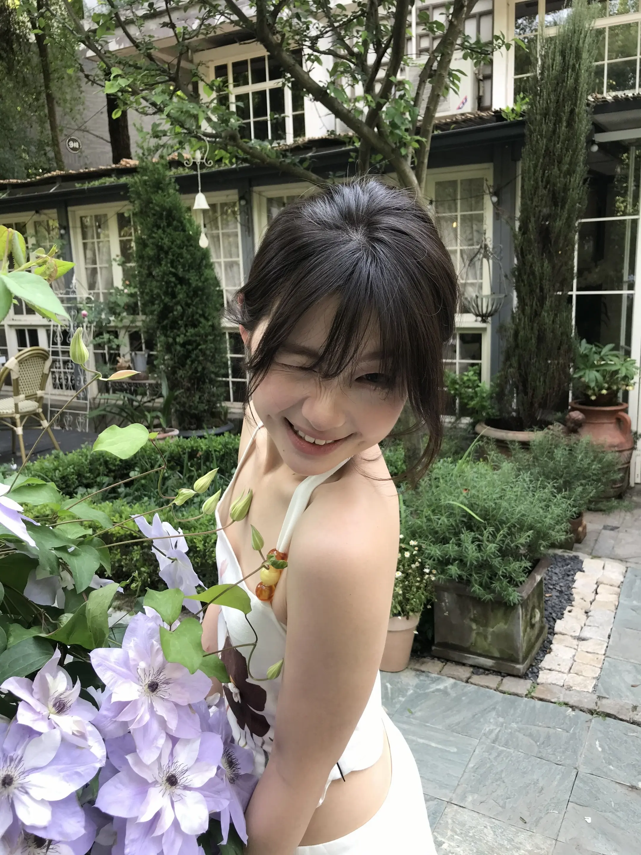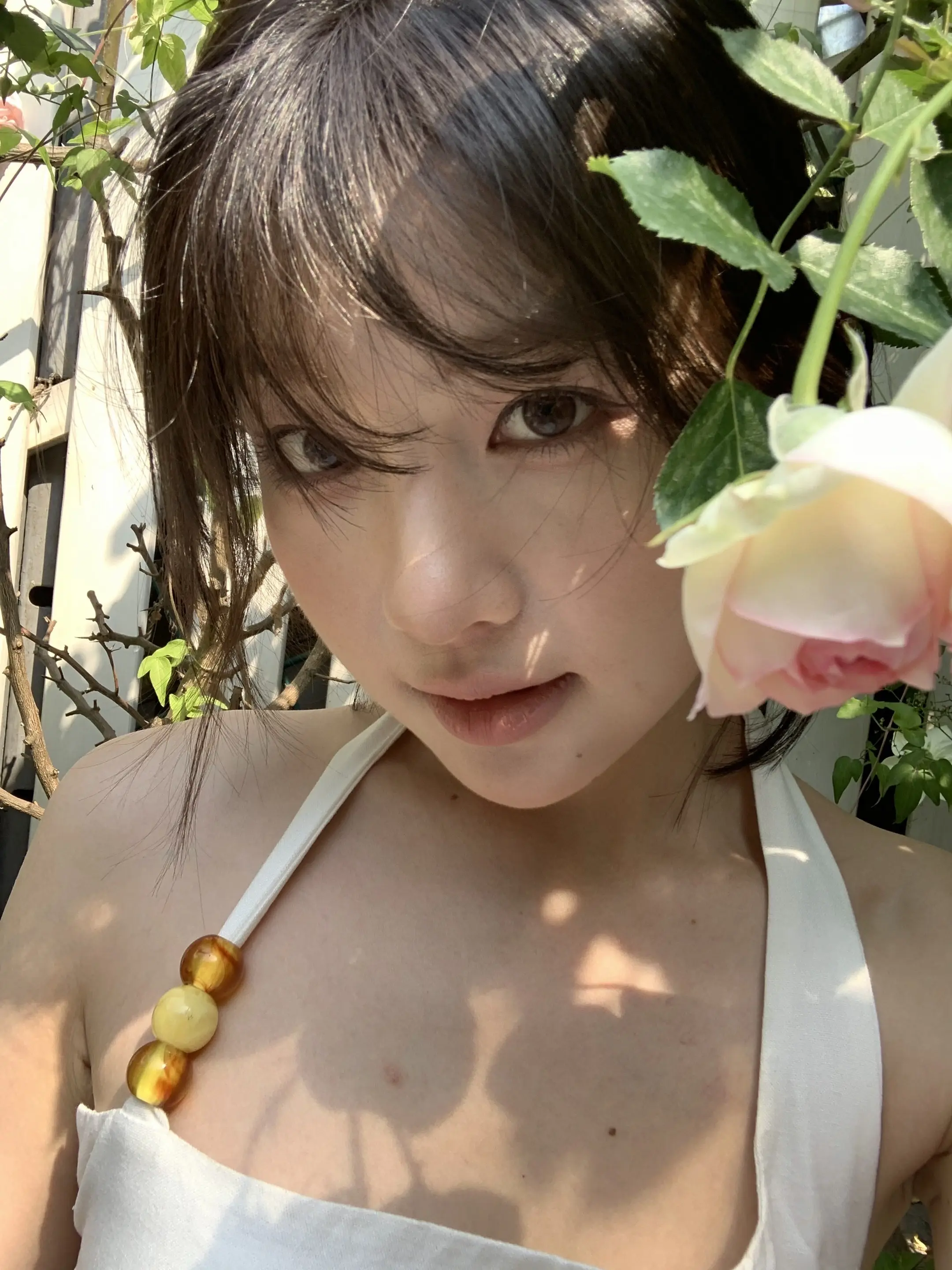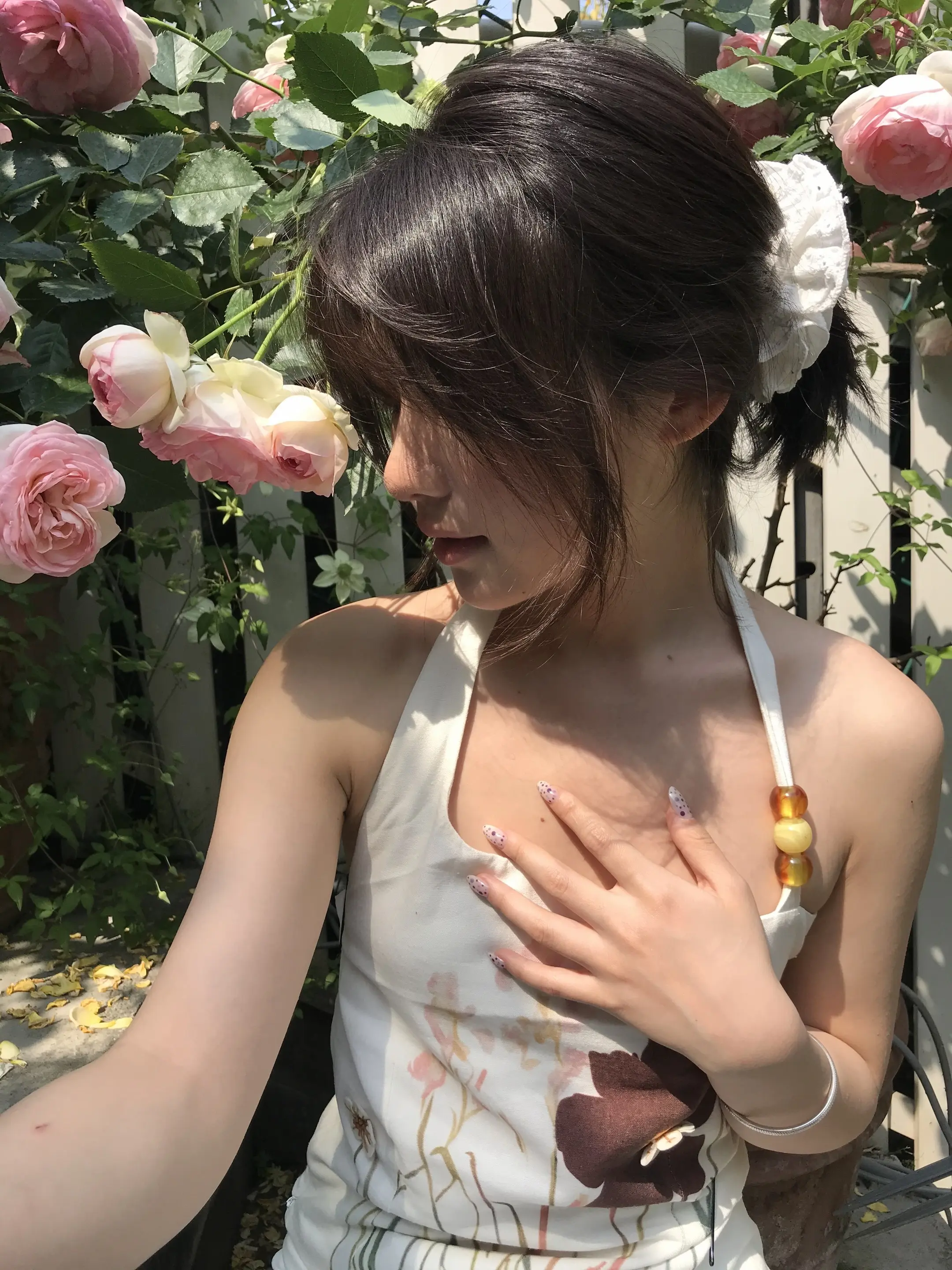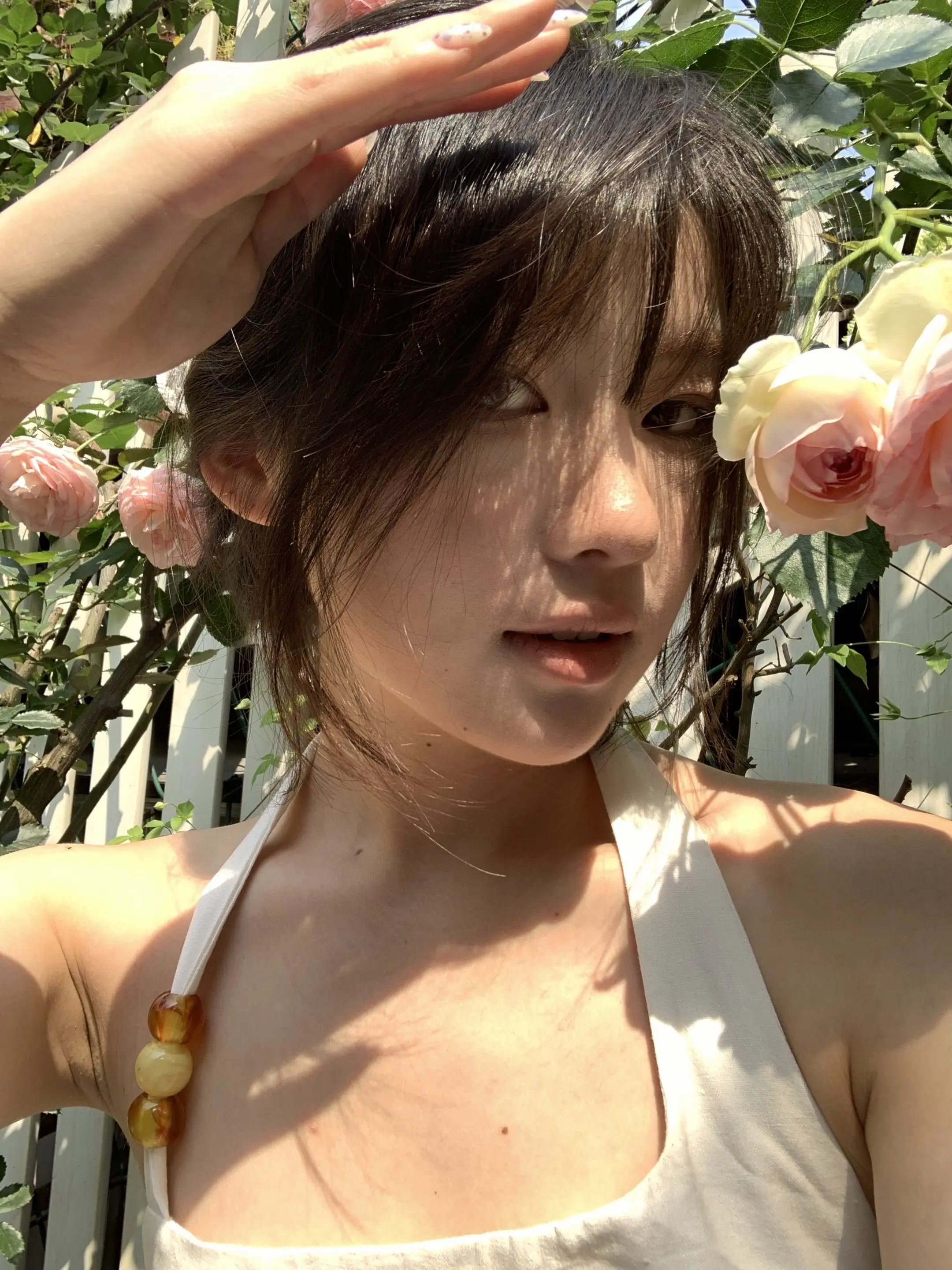 慵懒午后,温柔笑容,浅浅的米色连衣裙,自然光洒满房间。