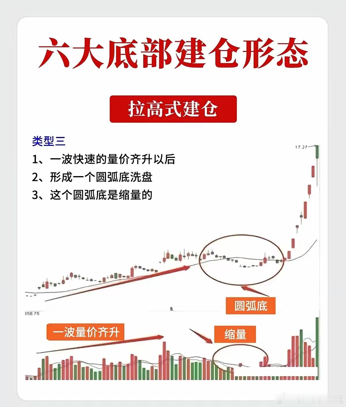 这六种形态是技术分析中关于主力资金在底部吸筹的经典图表模型。一、 横盘式建仓形态特征:股价在底部区域长时间窄幅波动,迫使不坚定的筹码离场,主力暗中吸纳。类型一:深V洗盘型* 形态特征: 1. 长期磨底:存在一个持续时间长达3个月以上的矩形横盘区间,股价波动极小。 2. 暴力洗盘:在正式突破启动前,主力往往会制造一次故意破位的假象(即“深V”杀跌),随后迅速被买盘拉回,以此彻底清洗恐慌盘。类型二:过顶放量型* 形态特征: 1. 箱体震荡:股价整体在极小的空间内(如20%-30%的振幅)进行长时间横盘。 2. 直接启动:当股价向上突破前期高点时,伴随成交量的显著放大(量超前量),形成大阳线继续上攻,这通常是行情直接启动的信号。类型三:突破回踩型* 形态特征: 1. 突破前高:经过超过3个月的横盘后,股价首次放量突破前期高点。 2. 缩量回抽:突破后,股价通常不会直线拉升,而是会再次缩量回调至前高附近支撑位止跌。 3. 介入时机:当股价在支撑位企稳,再次放量向上攻击时,是最佳的出手点。二、 拉高式建仓形态特征:主力不甘于漫长等待,通过快速拉升股价吸引市场眼球,在上涨过程中完成吸筹。类型一:阶梯式建仓* 形态特征: 1. 量价齐升:初期一波明显的上涨伴随着放量,回调时则明显缩量,体现健康的吸筹节奏。 2. 涨幅控制:这一波拉升的幅度通常不宜过大(一般控制在40%以内),以免过度抬高建仓成本。 3. 中途蓄势:一波拉升后开始回调,但往往会在这一波涨幅的50%位置止跌企稳。 4. 确认信号:随后出现一根放量并突破前期高点的阳线,标志着建仓结束,主升浪开启。类型二:无量诱多型* 形态特征: 1. 快速拉高:出现一波快速的、短时间的量价齐升,涨幅同样小于40%。 2. 急速回落:随后股价快速无量回落,甚至跌回至起涨点附近,给人一种“行情结束”的错觉。 3. 控盘启动:当主力吸筹完毕,再次启动时,往往只需要很小的量能就能推动股价上涨,这说明筹码已经高度集中(达到了高控盘状态)。类型三:圆弧底洗盘型* 形态特征: 1. 首轮拉升:先有一波快速的、明显的量价齐升。 2. 圆弧洗盘:随后股价进入长时间的横盘整理,形成一个平滑的圆弧底形态。 3. 缩量筑底:在这个圆弧底构筑的过程中,成交量极度萎缩,说明抛压已尽,主力控盘度极高。免责声明:以上内容仅为技术分析理论的总结与图表形态解读,不构成任何具体的投资建议。股市有风险,投资需谨慎。金价a股现货黄金
